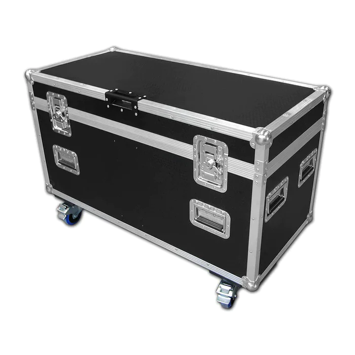 The CHAUVET PROFESSIONAL 4-Fixture Road Case for Rogue Outcast 1 Beam Wash Lights is a heavy-duty, advanced "crate" that is shipping-ready. It is made of metal with metal sides and corners, wheels, and recessed handles.