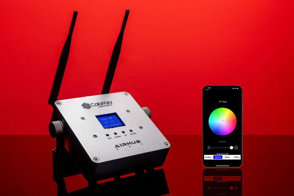 For even greater control, add the ColorKey AirHub DMX to your setup. The AirHub is a battery-powered Wi-DMX transceiver, and the central control hub of the Air Series ecosystem. The AirHub can generate a WIFI network for use with the optional AirApp for iPhone and iPad.
