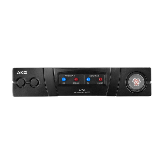 The APS4 is a wide-band UHF active Antenna and Power Splitter that can feed up to 4 receivers with the RF signal coming from one pair of antennas and also supplies power to all connected receivers via BNC cables. The splitter operates in an extended frequency range of 470 to 952 MHz. Adjustable RF-level attenuation settings guarantee maximum operating distance even when using different cable lengths and different types of cables. The APS4 comes in a rugged half-rack metal housing and works with all active and passive AKG antennas available on the market (RA4000 B/W, RA4000 W, SRA2 B/W and SRA2 W). The product is shipped with a rack mount kit (RMU4000), two front mount antenna cables and ten BNC cables (MKPS) for an immediate system setup. The APS4 sets are available in four different power supply variants: EU, US, U.K. or none included. Two rear panel antenna inputs provide a 10 VDC supply voltage for powering up to three active elements per antenna path. E.g. one active antenna (RA4000 B/W or SRA2 B/W) and two AB4000 antenna boosters connected to one RF input. Also located on the rear panel are two sets of four BNC antenna output connectors for feeding up to four diversity receivers and two additional antenna outputs for cascading up to three further APS4 devices.