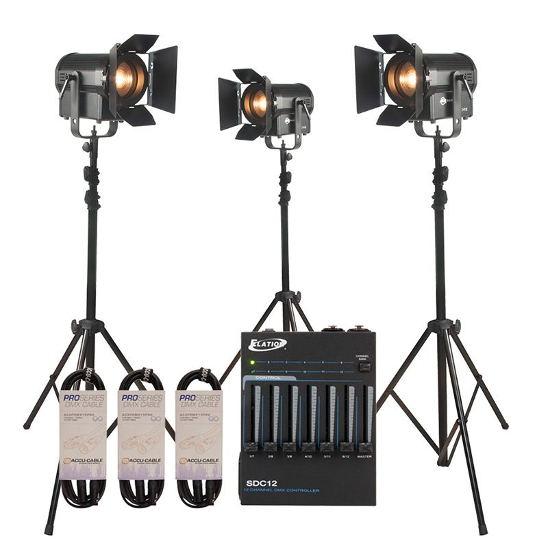 For content producers and multi-person performances who need more light output plus onboard DMX control for front and fill lighting. Includes three LED studio lights for key and fill lighting, barn doors to direct light output, three lighting stands, lighting controller with dimming capabilities, plus DMX cables to connect the lights to the controller.