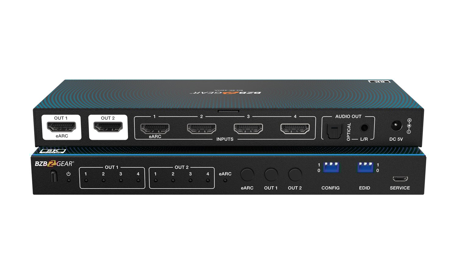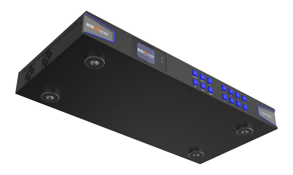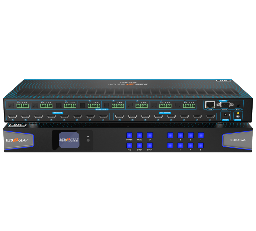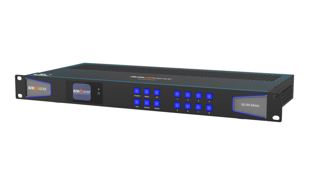 The BZBGEAR 8K HDMI matrix switch allows routing up to 8 HDMI sources with up to 8 displays.