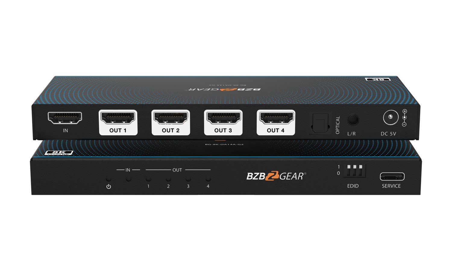 BG-8K-DA14 / BG-8K-DA14A-G2 – 1x4 HDMI 2.1 splitters for distributing one source to four displays simultaneously.