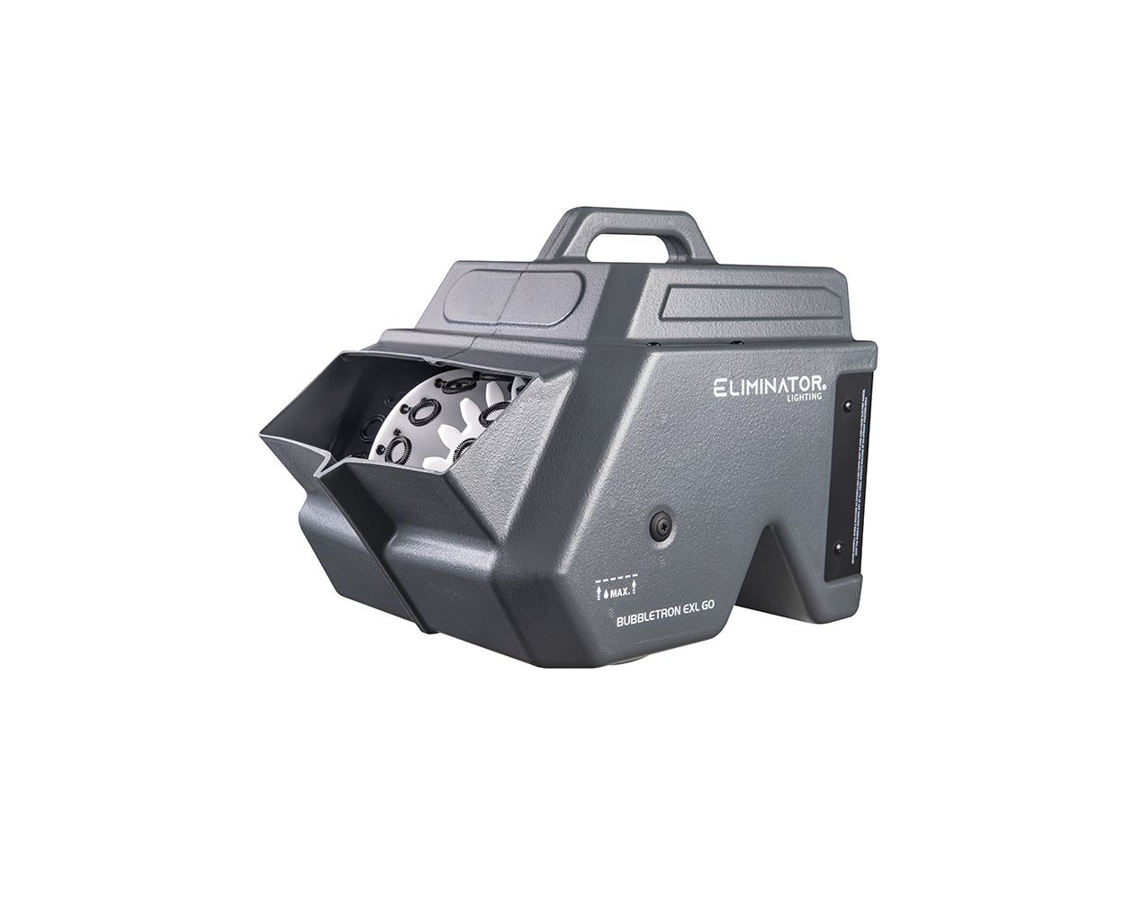 The Eliminator Lighting Bubbletron EXL GO is a light weight, battery-powered bubble machine with a dual fan system that pushes bubbles up in the air so they can travel further. The unit’s integrated 4 Ah battery allows up to 3 hours of continuous operation with a 4-hour recharge time. It features a 5-segment battery charge indicator on the rear panel. Includes wireless remote.
