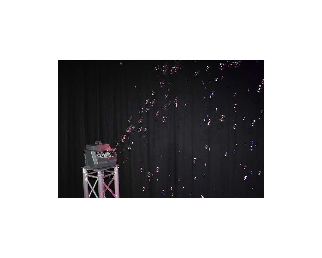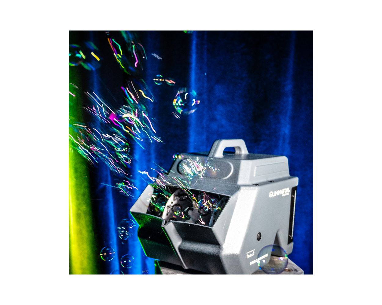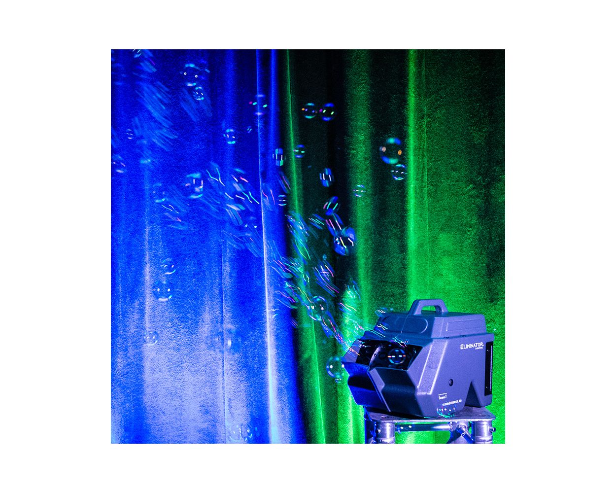 The Eliminator Lighting Bubbletron EXL GO is a battery powered bubble machine. It is a lightweight and durable option, making it a great for production companies doing a lot of setups on smaller sized stages and prioritize neatness and time.