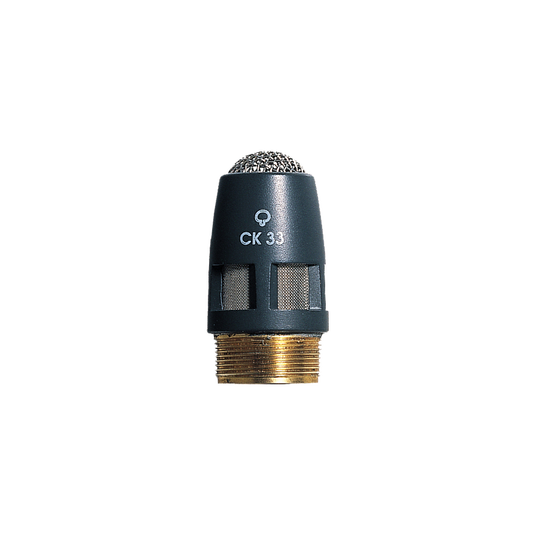 The CK33 is a high-performance hypercardioid condenser microphone capsule and a good choice in situations when noise comes from the sides or people talk into the microphone from greater distances. The CK33 capsule is integrated into a rugged metal housing and fits any mounting module of the DAM Series. To prevent contact problems, the capsule is equipped with large-area, self-cleaning, gold-plated contacts with deep threads to prevent misalignment and ensure extra-long life. The package includes a special two-part windscreen, which reduces wind and pop noise.
