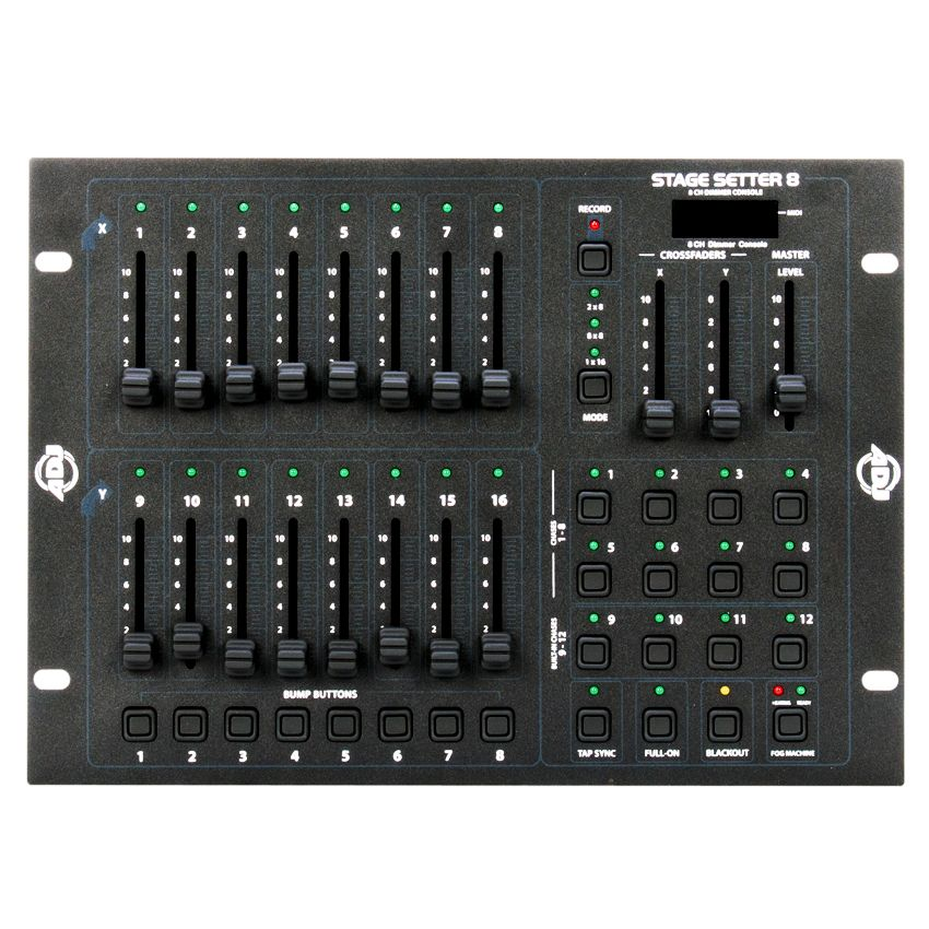 For the effective control of par cans via dimmer packs the Stage Setter 8 from ADJ offers versatility of operation through 3 different operating modes, four build-in programs, and eight user programmable programs. It operates using standard DMX-512 protocol, is MIDI compatible, and includes a fog machine output control.