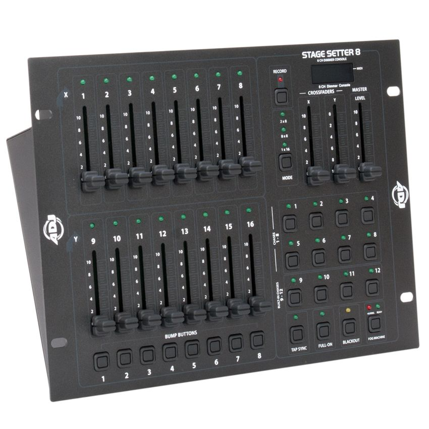 Complete your par can setup by tying it all together with the Stage Setter 8 DMX Controller. This quality constructed DMX controller offers you the ability to fully control the dimming and on/off of your par can setup via dimmer packs. Operating in 3 separate modes and offering a range of customization and built-in programs, the Stage Setter 8 is an essential component of any par can lighting production. Functioning on standard DMX-512 protocol as well as MIDI compatible and including fog machine output control, the Scene Setter 8 can be tied into your entire production system with ease. This portable device is perfect for any size stage production, permanent or mobile. Manage your lighting like a true professional, get the Scene Setter 8 from ADJ today.