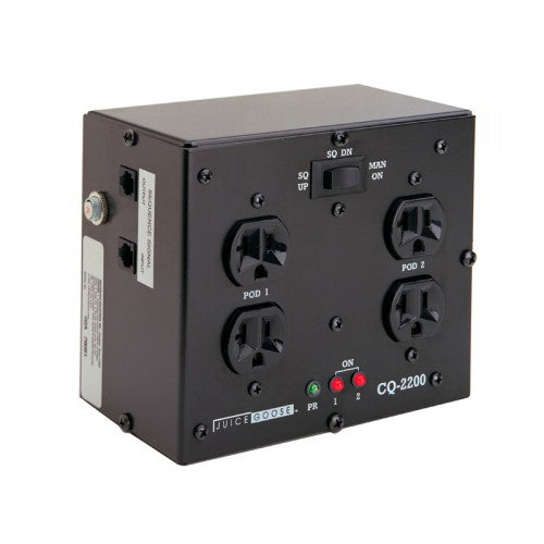 The Juice Goose CQ-2200, along with the other products in the CQ Series, provides a versatile and powerful means of remotely activating AC power in a sequenced array for application to both sensitive and high amperage equipment. CQ Series products need no additional controllers. Each contains the circuitry to be activated by a simple contact closure and to perform in coordination with other CQ devices. All power down sequences are exact reversals of the power up sequences.
