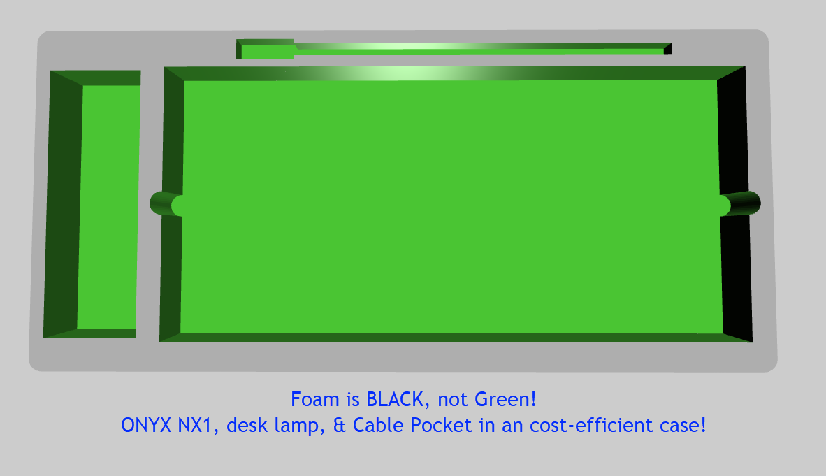 This is a custom-cut case for the ONYX NX1 made from Doro D3114-5 case with custom cut foam. It features space for the NX1, desklamp, and cables at an affordable price. We use high-grade foam with excellent durability for a case that will outlast the console itself when cared for!
