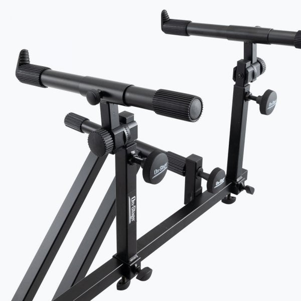 Our KSA8500 Deluxe Keyboard Tier features two sets of support arms to support additional keyboards on your main keyboard stand. Each pair of arms features independently adjustable height, tilt angle, length, and width to hold a variety of keyboards and other devices in optimal playing position. Compatible with any 1" square-tube or 30 mm round-tube stand, as well as our Folding-Z stands, our Deluxe Keyboard Tier is a versatile choice for second- or second-and-third-tier customization.