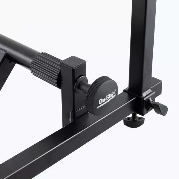The KSA8500 Deluxe Keyboard Tier is an add-on tier designed to hold one or two additional keyboards or devices above a main keyboard stand. It mounts to 1" square or 30 mm round tubing, including Folding-Z style stands. Each set of arms adjusts for basic positioning to accommodate different setups.
