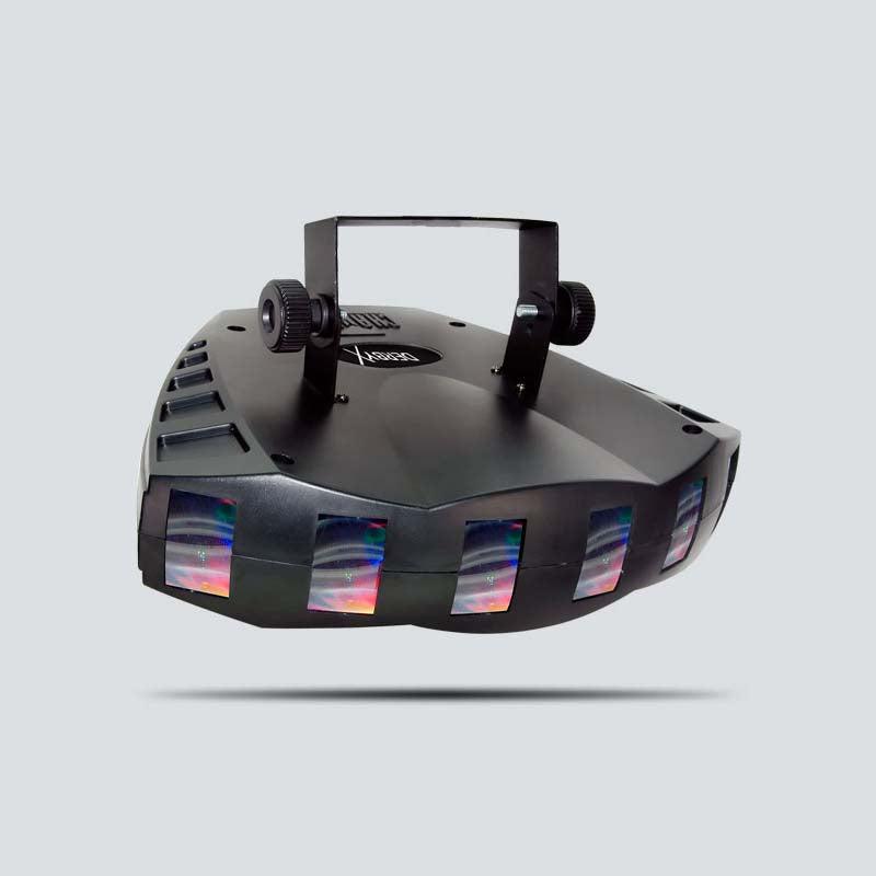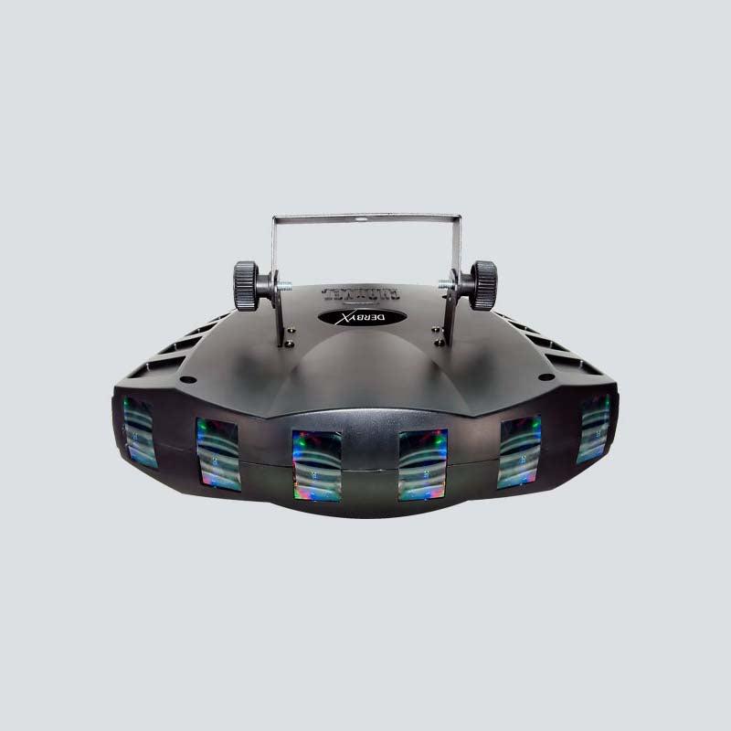 The Derby X is a DMX-512 LED derby effect light, featuring individual control of all 6 LED clusters. Additional features include blackout/static/strobe, built-in automated and sound activated programs, and linkable power for up to 27 units.