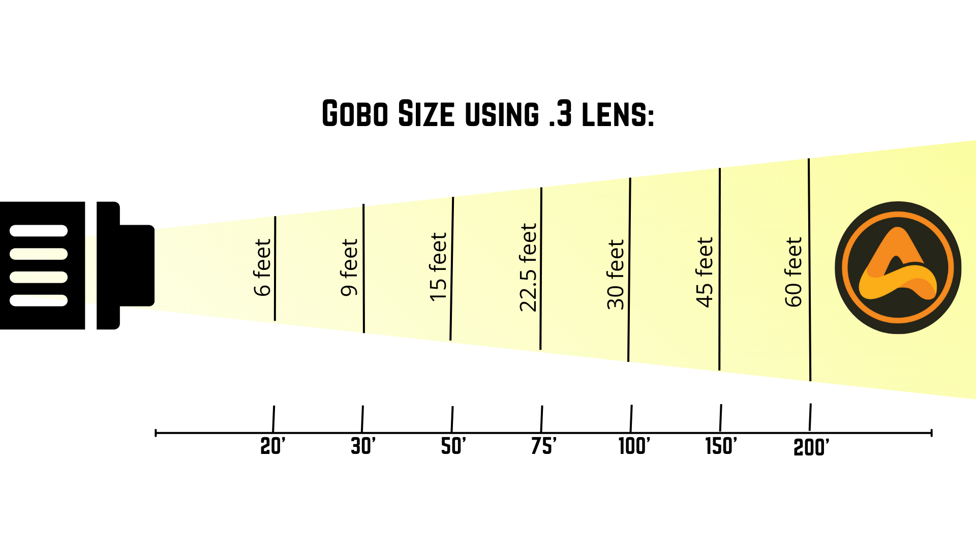 Lens math - to determine the size of the gobo, take the distance from the lens and multiply it by the lens factor. For example, a 10' throw x .3= 3.3' circle.