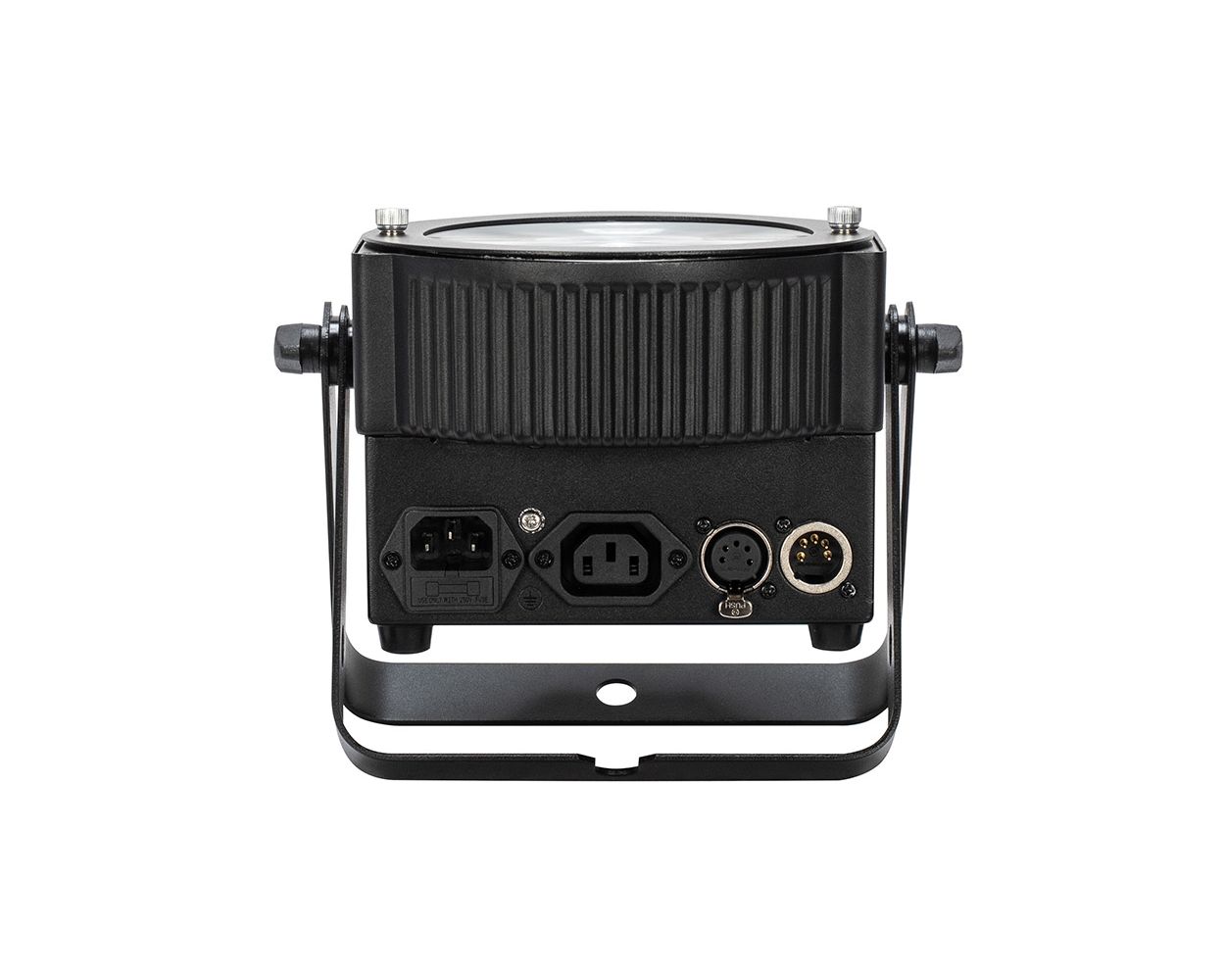 The fixture has IEC power in and out sockets to daisy chain power, plus 5-pin DMX in/out sockets. The supplied scissor yoke allows for flexible use allowing the fixture to be hung in the air or set on the ground.