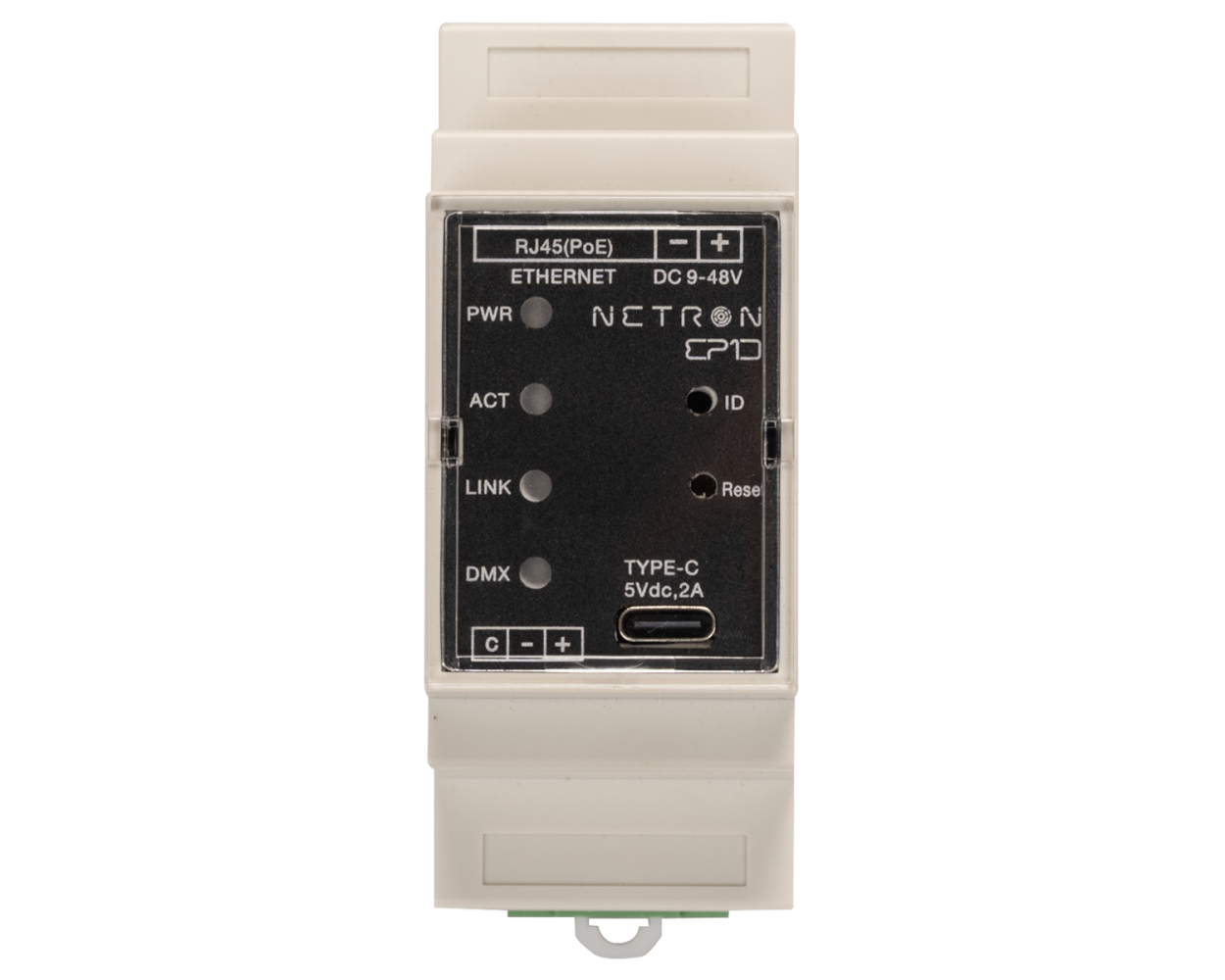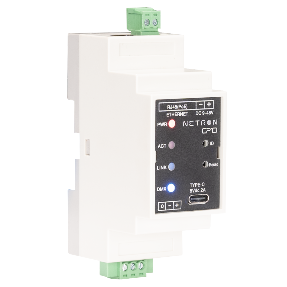The NETRON EP1D is a DIN-Rail Ethernet to DMX gateway with a single RDM compatible port.