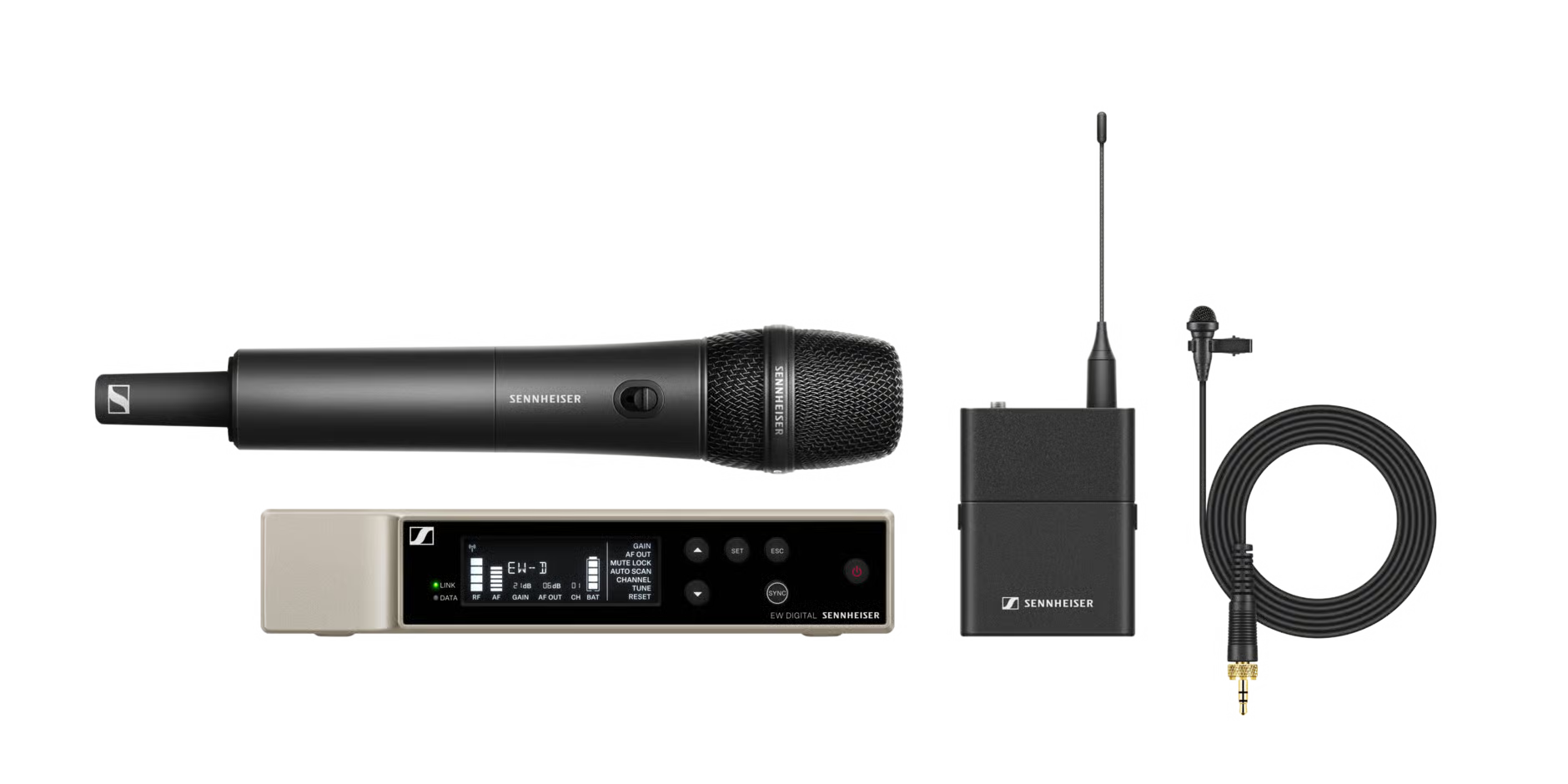 All-in-one combo set for digital wireless applications featuring stationary receiver, handheld transmitter and clip-on microphone.