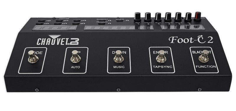 Foot-C 2 is a full-featured compact DMX foot controller with up to 36 channels of control. Create and control a full light show of chases, scenes, fades, and more with just the tap of a foot! Easily change from scene to scene using the up and down pedals and achieve instant blackout with the press of a pedal. Foot-C 2 has guitar pedal-style buttons and a bright and easy-to-read LED display that shows modes, functions, and values to provide convenient and durable access to light shows. Foot-C 2 has included MIDI input for a perfectly timed show and direct audio line input triggers scenes with amazing accuracy. Foot-C 2 is designed to work with fixtures that have up to 6 channels.