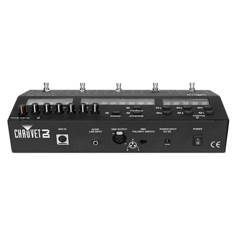 - Guitar pedal-style buttons provide convenient and durable access to light shows