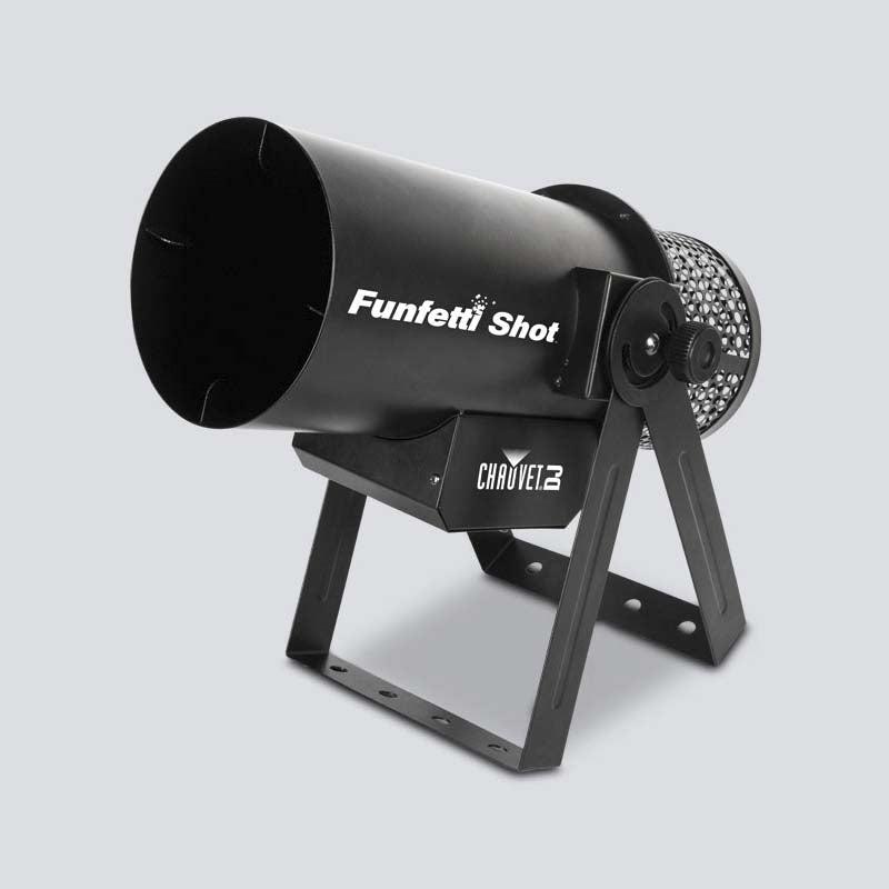 The Funfetti Shot works with Funfetti Shot Refill – Color, Funfetti Shot Refill – Mirror, and Funfetti Shot Refill – UV, as well as most other confetti types. It is easily controlled from the display, the included wireless remote or DMX. The Funfetti Shot includes a double bracketed yoke for easy floor mounting or hanging on TRUSST and fits best in the CHS-50 VIP Gear Bag.