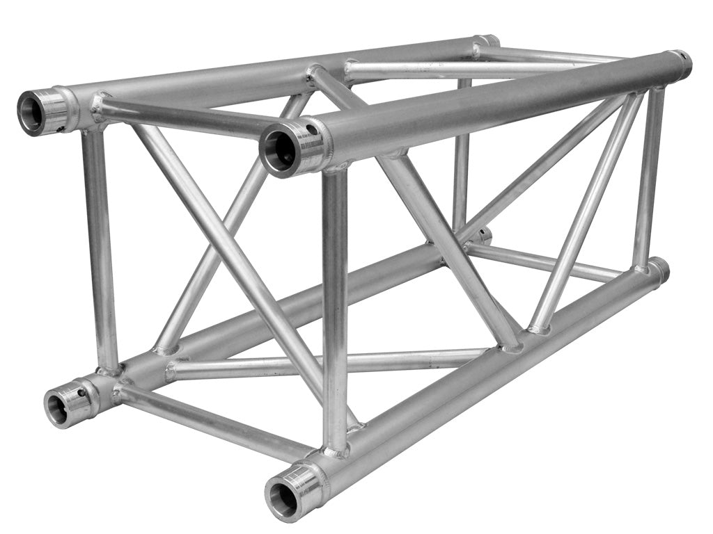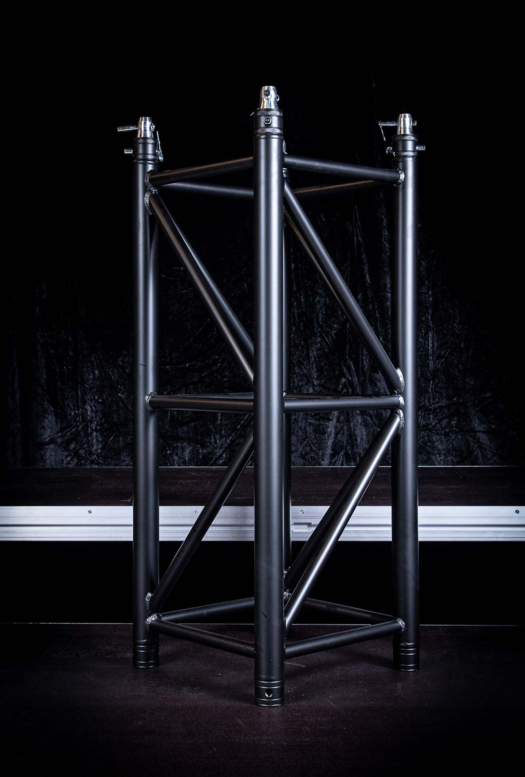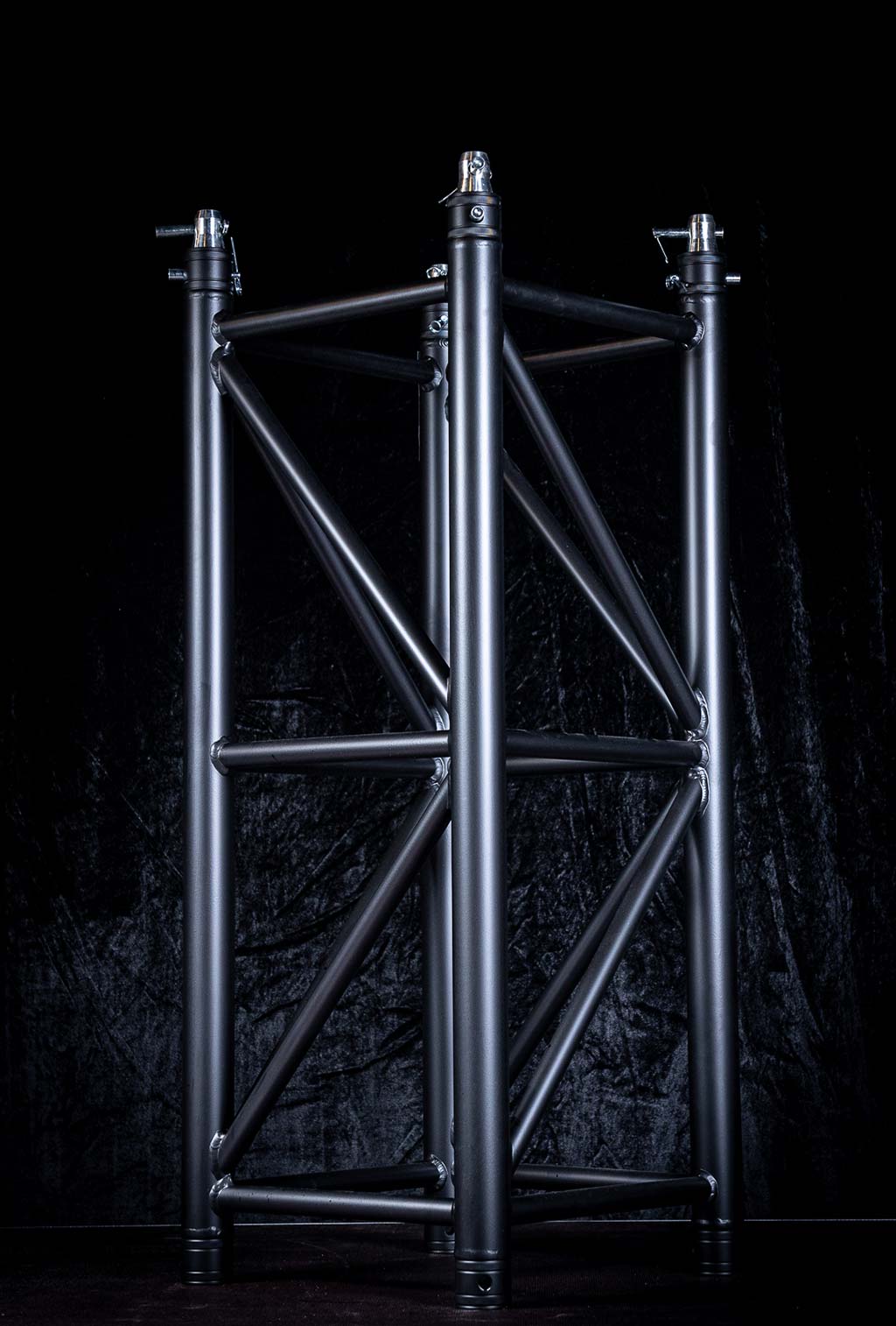 Our 400mm GT-Truss (GT-400) is a 4-point truss system. This provides optimum volume and load capacity for its construction size and a tube diameter of 50mm. This system is connected via a special conical connector system, which is joined together to a complete form fit by means of a copper hammer, creating optimal traction. It is also characterized by a minimum transport volume and the special lightweight design. The conical connectors are of course included in the scope of delivery – special designs and powder coatings can be carried out at short notice. This size truss offers a higher load capacity compared to any of our other sizes.