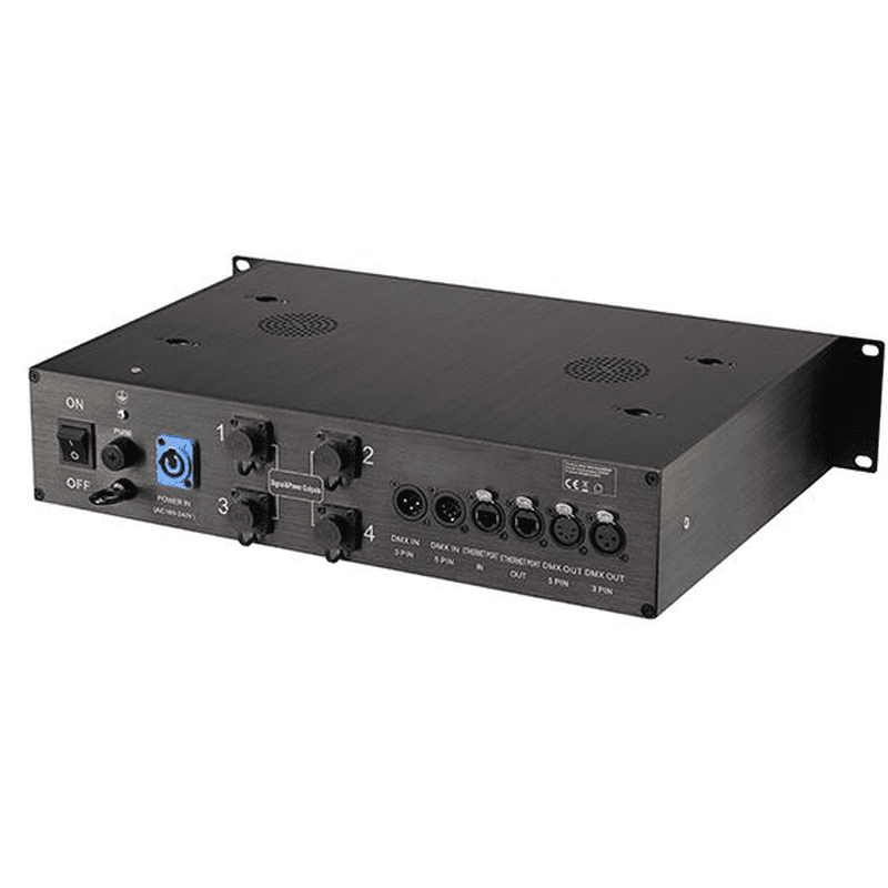 The accompanying Gamma pixel strip driver has 4 output ports, each allowing up to 8 strips per port with a maximum cable length of 200 feet. Full pixel control is achieved over Art-Net, or alternatively, standard DMX can be used with built-in macros.