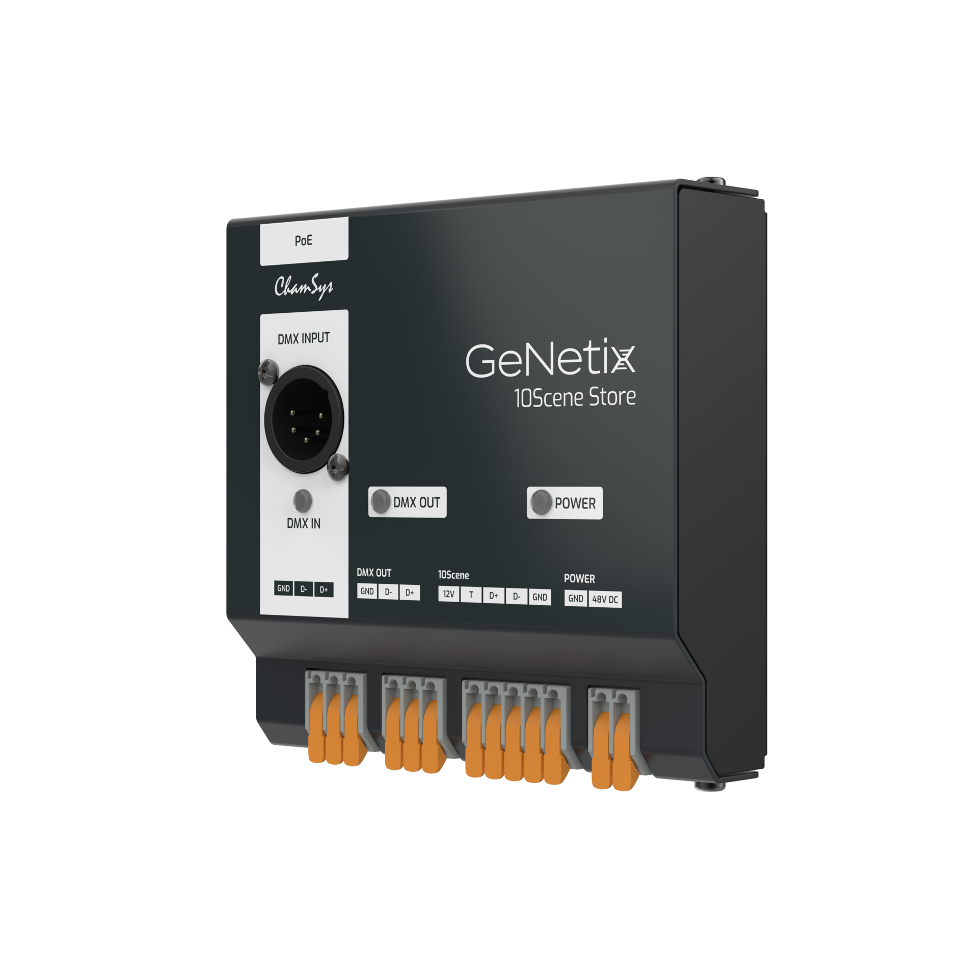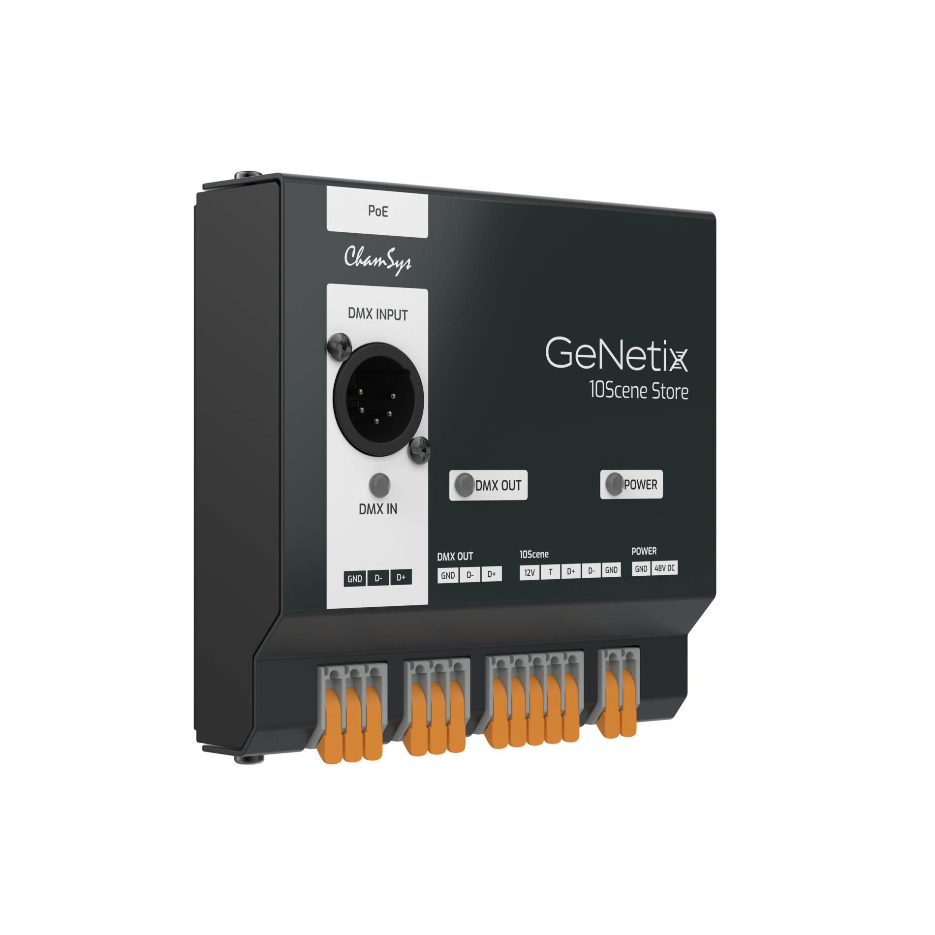 GeNetix 10Scene Store is a single universe wall or DIN Rail mounted standalone playback device that stores 10 static lighting Scenes (cues) which can be recalled with connected 10Scene wall plates. Load Scenes from either QuickQ or MagicQ show files or program via its in-built DMX Input port. Powered by either PoE or external 48V power supply, this simple installation device supports up to ten 10Scene wall plates, and features one DMX IN (XLR5 & Wago), one DMX OUT (Wago) and a network port.