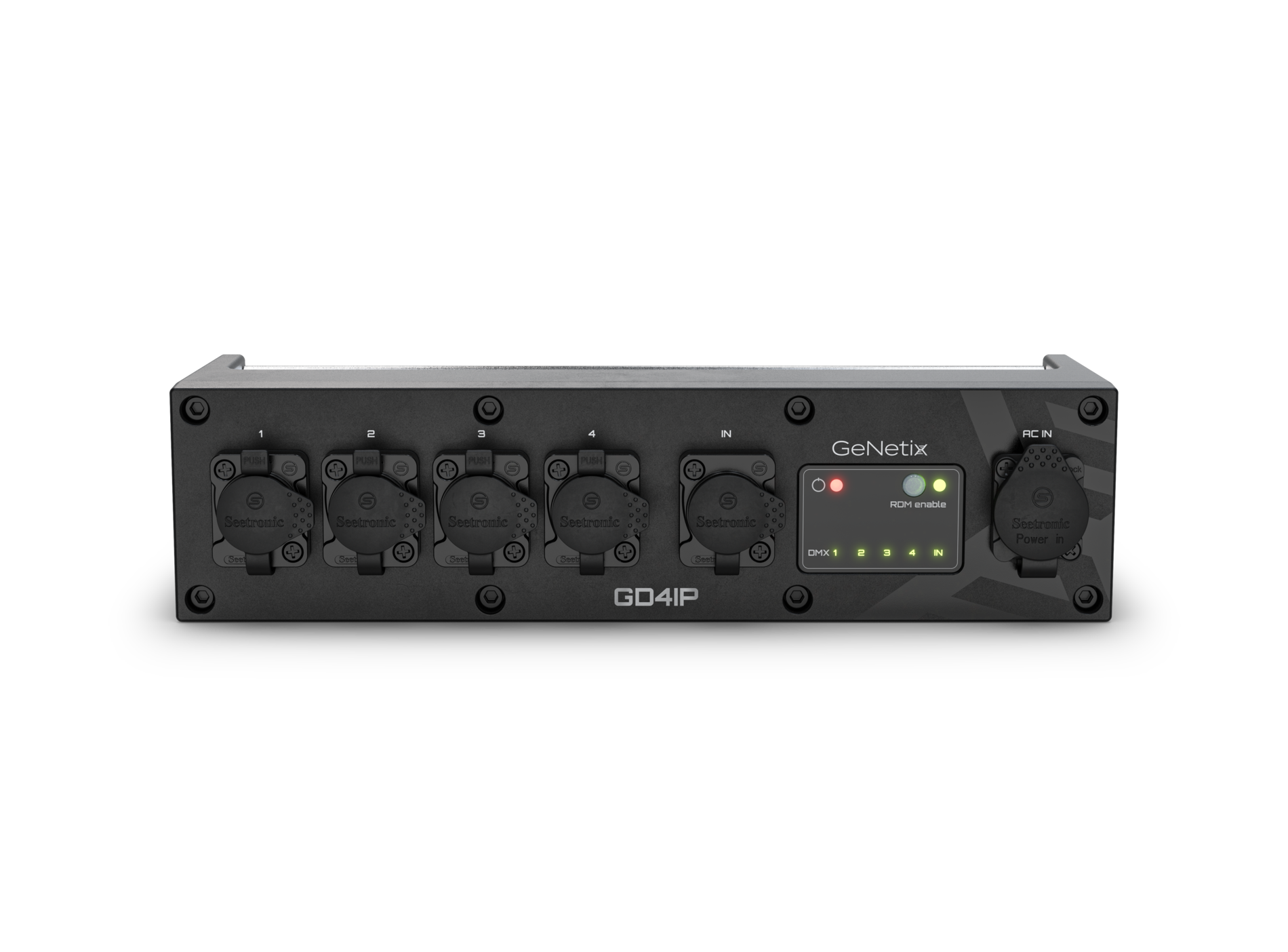 GeNetix GD4IP is a compact IP65-rated 4-port DMX Splitter that comes with multiple rigging options for easily mounting in your rig. Featuring 1 DMX Input to 4 DMX Outputs and an ‘RDM Disable button’ to strip out RDM data and retime the DMX signal, this ruggedly built device comes with Seetronic IP65 connectors and a PowerCon True1 Mains Input connector.