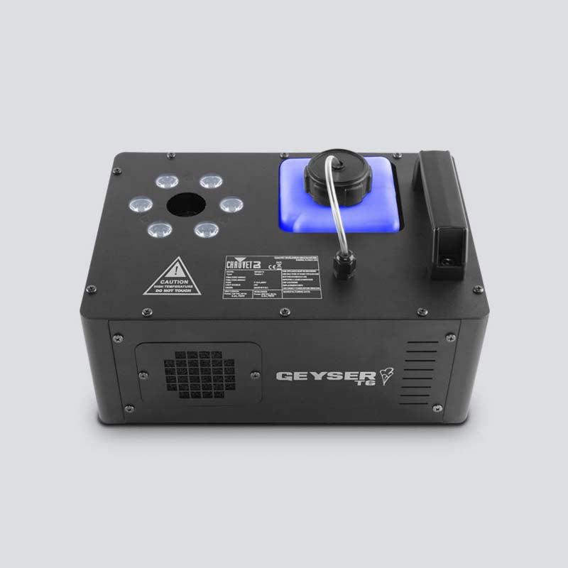 Geyser T6 brings a burst of lighting energy to your events with a pyrotechnic-like effect. Geyser T6 illuminates bursts of water-based fog with 6 tri-color (RGB) LEDs. Its advanced fluid sensor with automatic shut off protects the pump from overheating. Compact and lightweight, Geyser T6 is perfect for mobile applications.