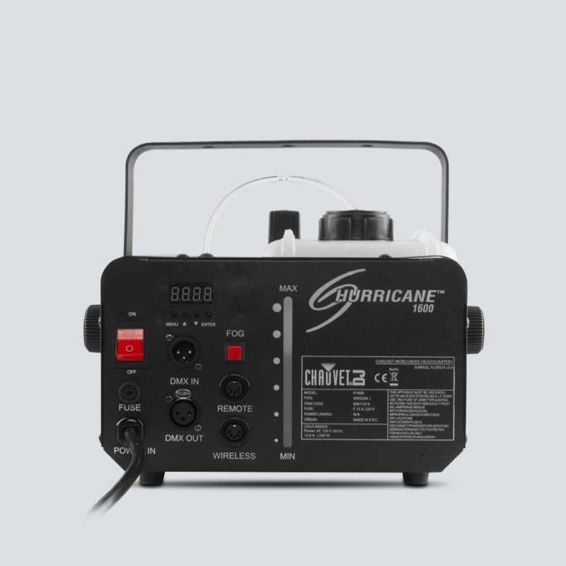 The Hurricane 1600 is a compact, lightweight high output fog machine with DMX control that enhances any light show. Variable output control from DMX or the included timer remote allows for precise effect operation.
