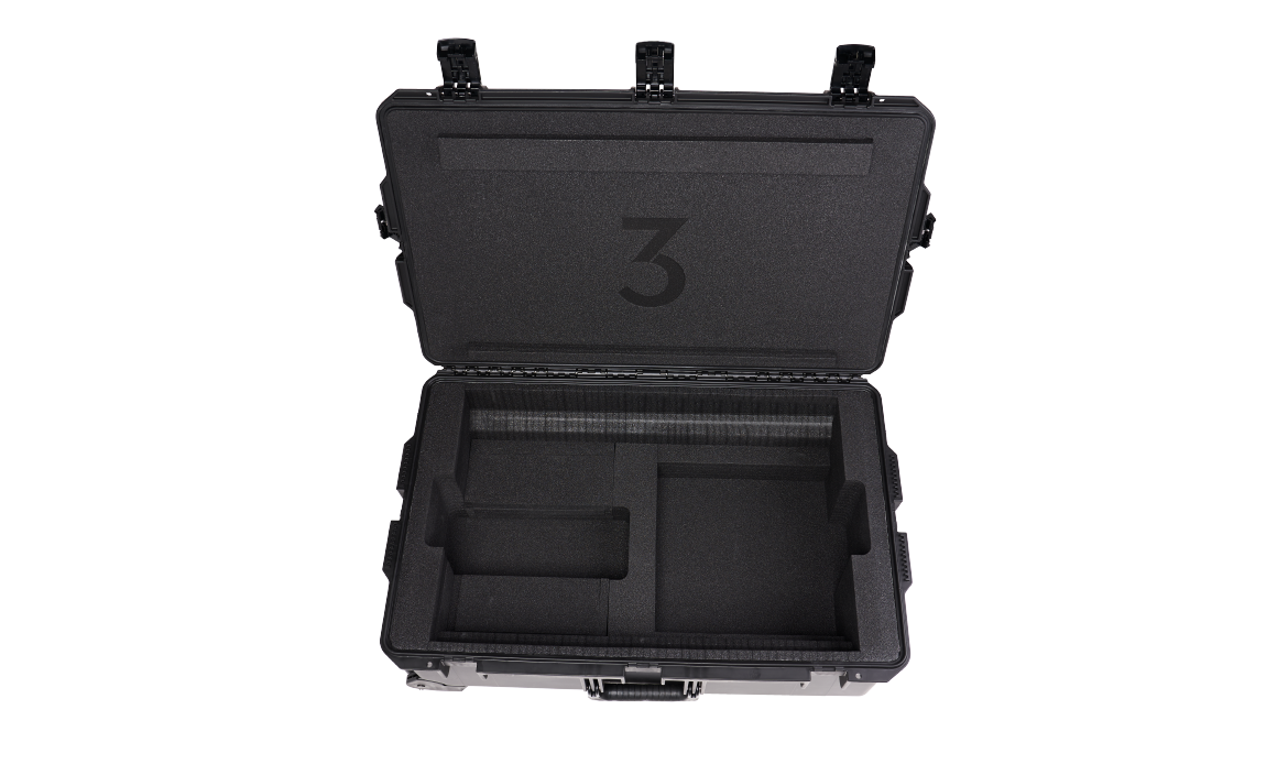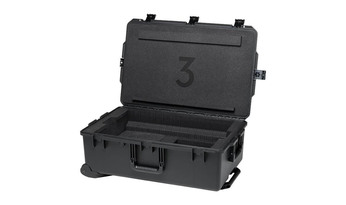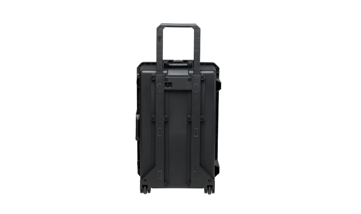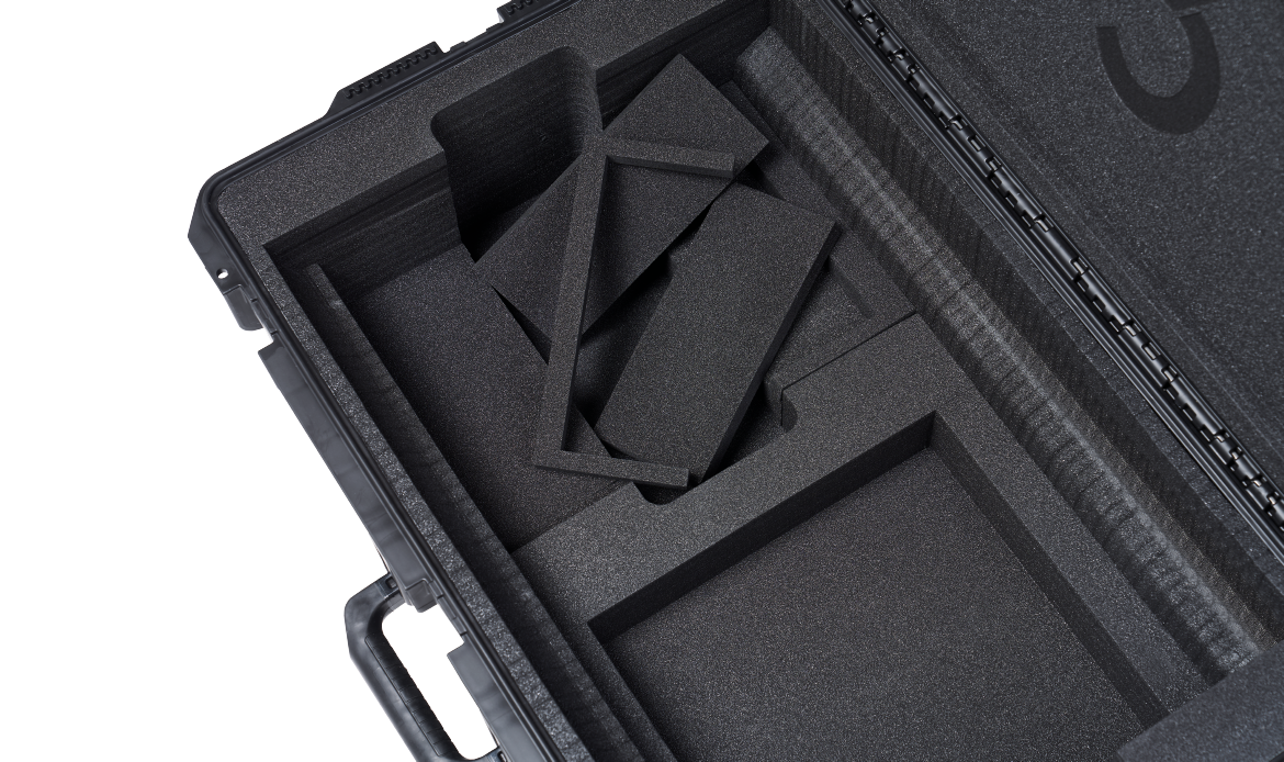 This extremely lightweight, dust proof and high impact-resistant flight case by PeliTM is watertight (IP67 certified) and equipped with a valve for automatic air pressure regulation while keeping water molecules out.