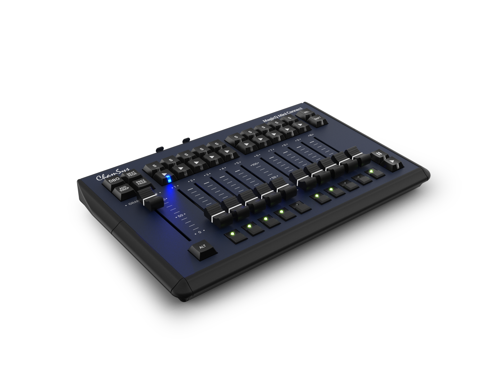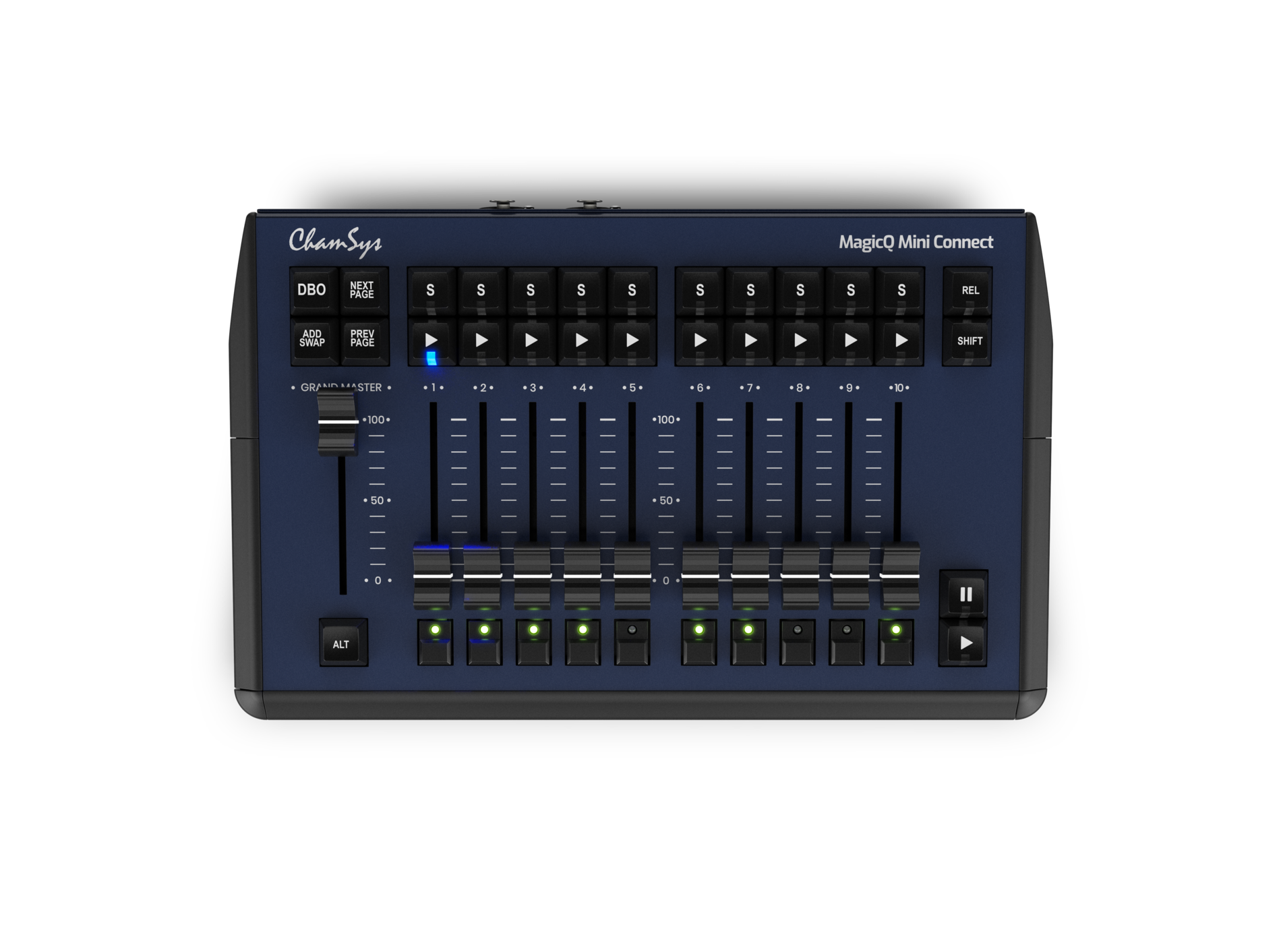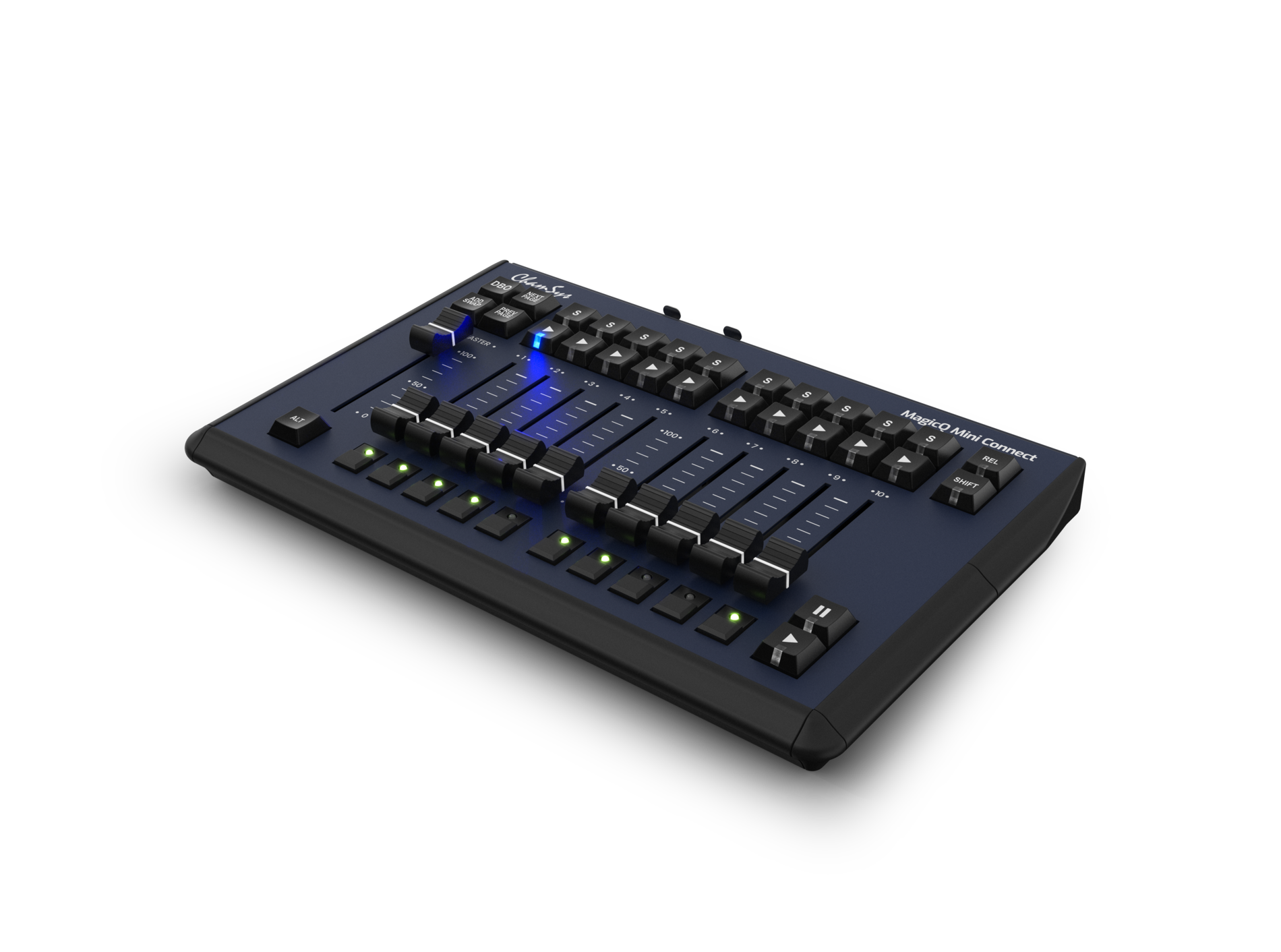 Attached to a Windows, macOS or Linux system running MagicQ software, the Compact Mini Connect turns your computer into a powerful lighting, media and LED control center. Live show controls include 10 playback faders, Flash, Go and Select buttons, and a dedicated Grand Master fader.