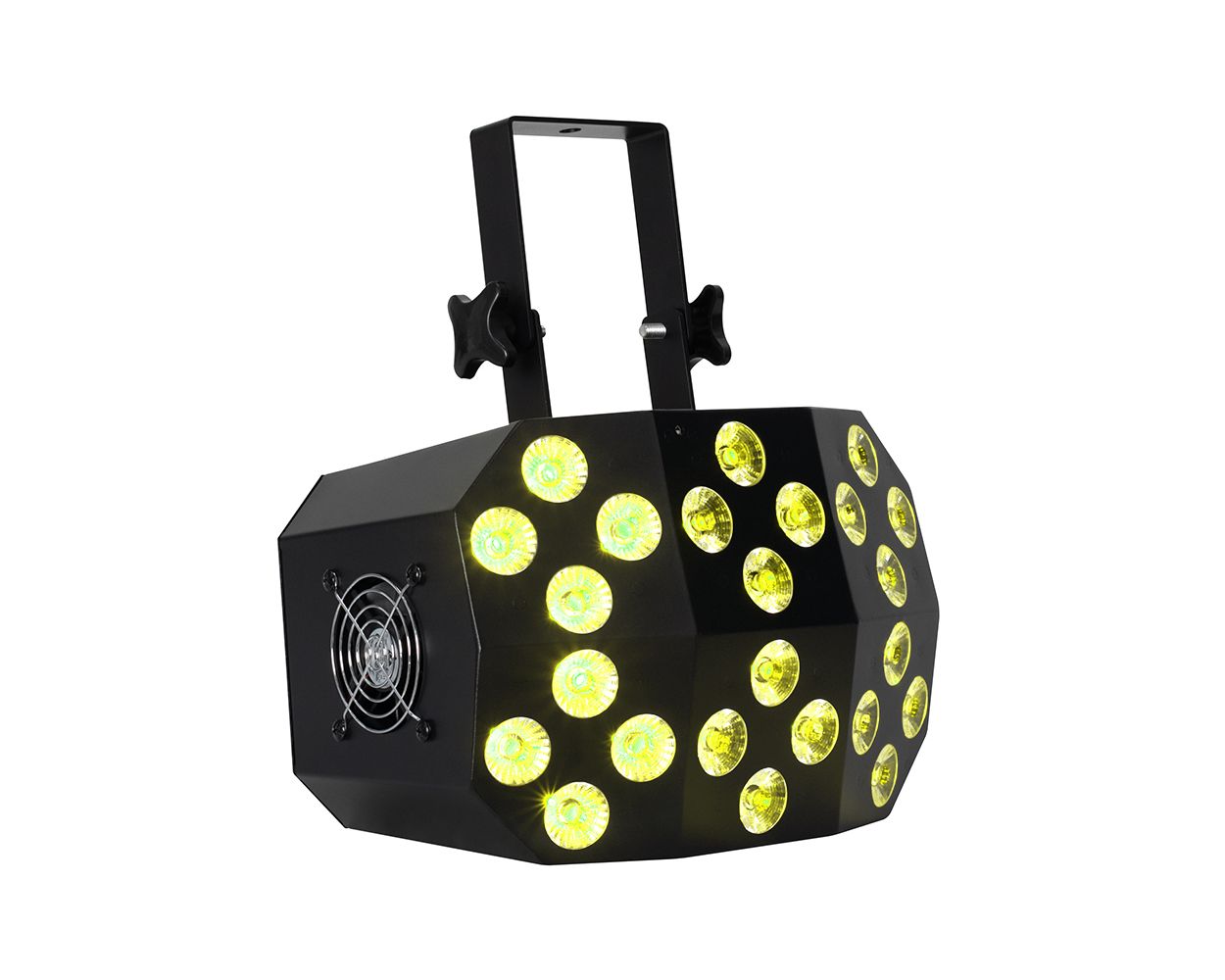 The Mega Wash 24 is a compact fixture great for wash and strobe effects. It is a good option for smaller stages, great for mobile DJ setups.