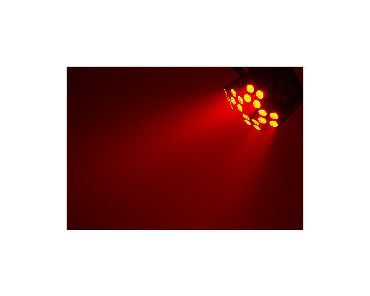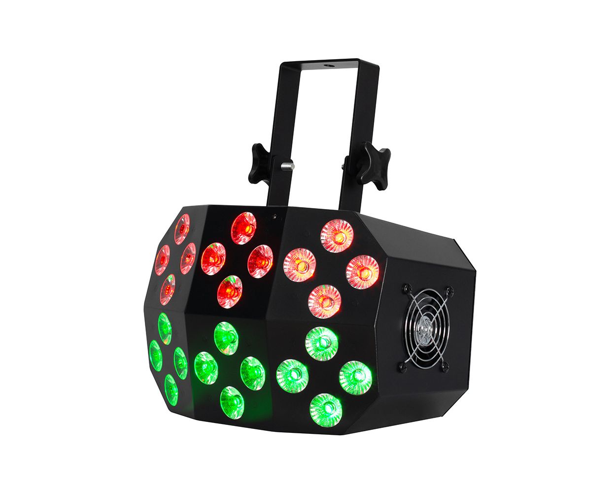 The Mega Wash 24 is a compact entertainment lighting fixture that produces vibrant washes of color and strobe effects for diverse applications, from pulsating club environments to enhancing mobile DJ setups and transforming event spaces, bars, lounges, and fun centers. It powered by twenty-four 10-Watt, 6-IN-1 Hex LEDs and includes a wireless remote control.