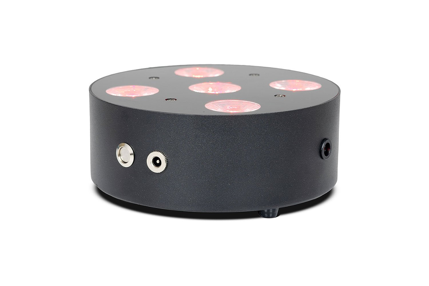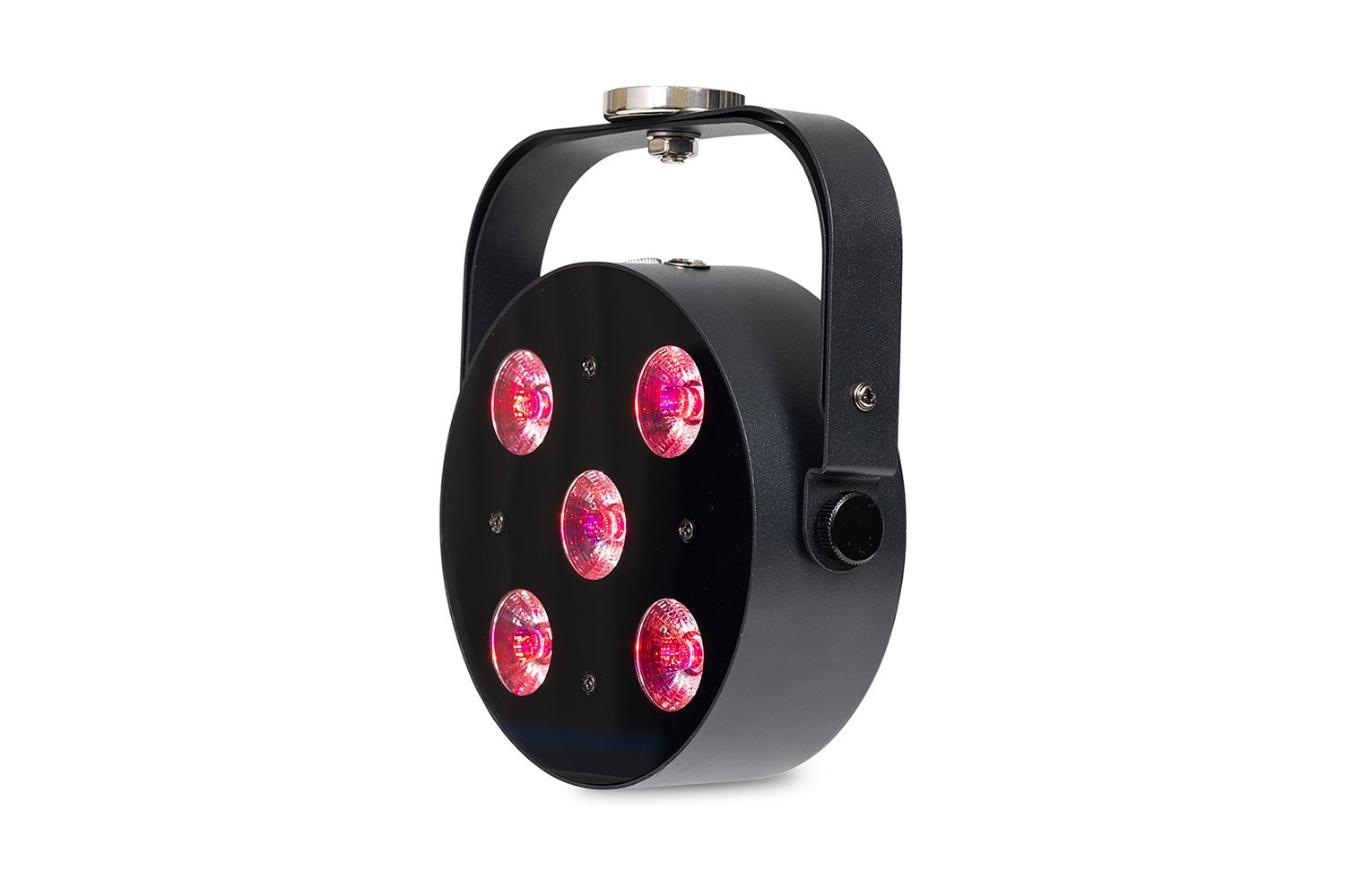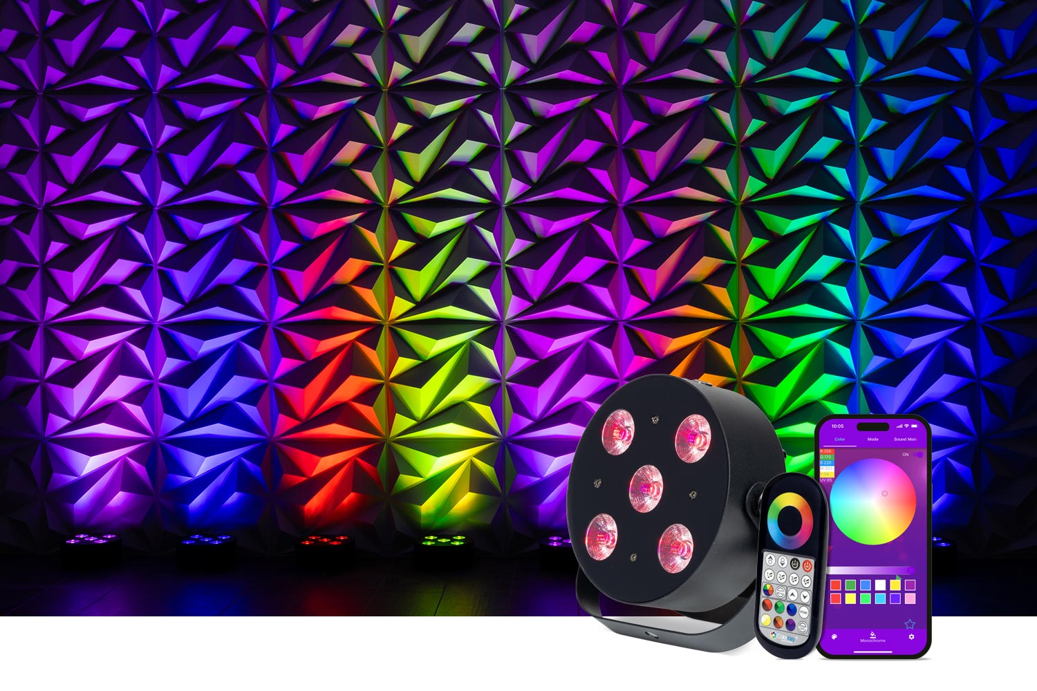 The MobilePar HEX 5 can be controlled via wireless DMX, an included RF remote, or an iOS app.