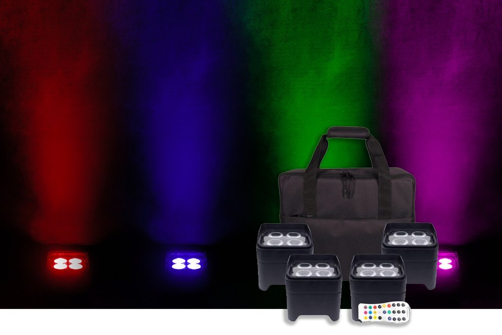 This bundle includes four MobilePar Mini HEX 4 compact wireless uplights and a carrying case, perfect for mobile performances or lighting up smaller venues.