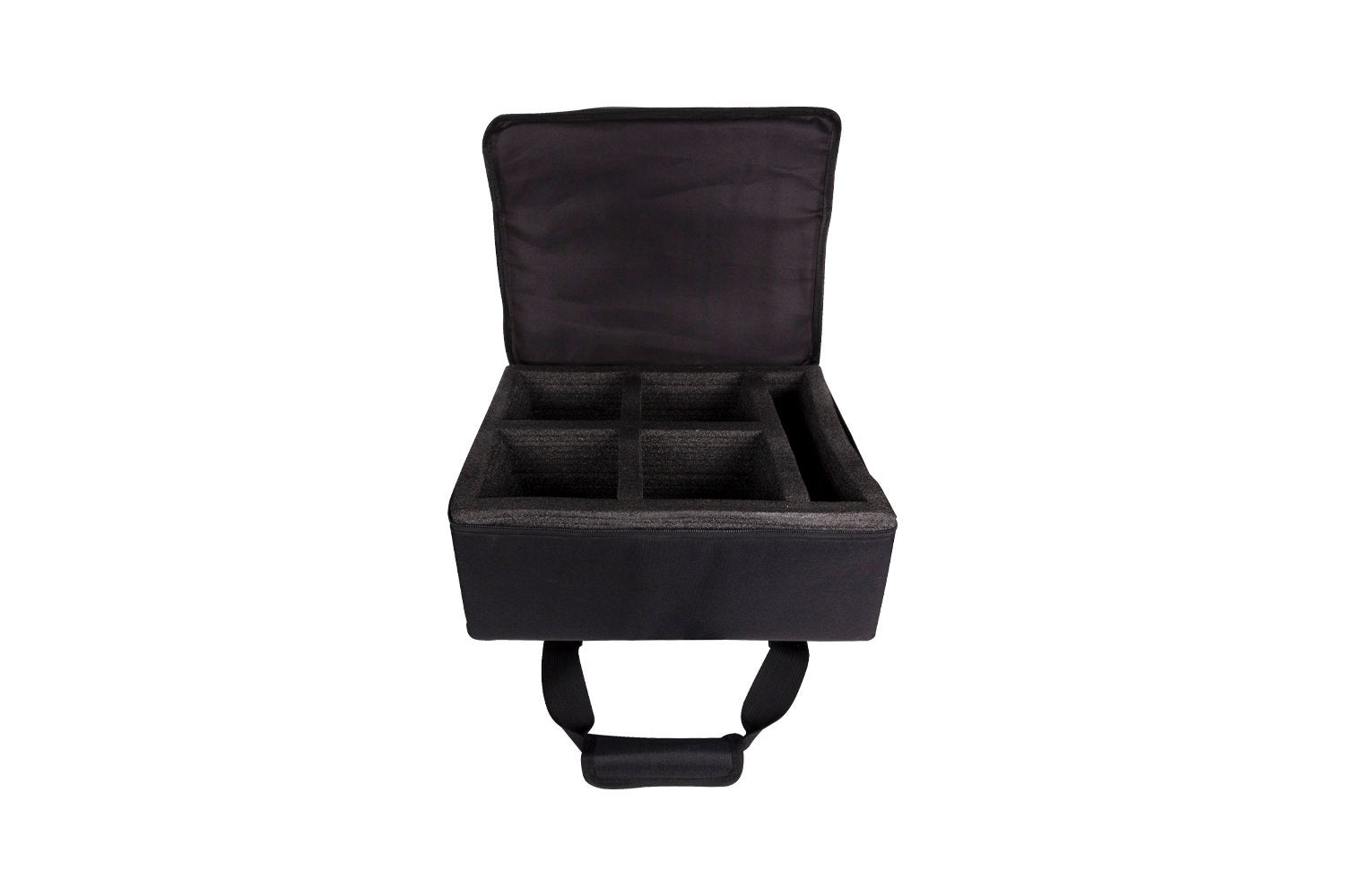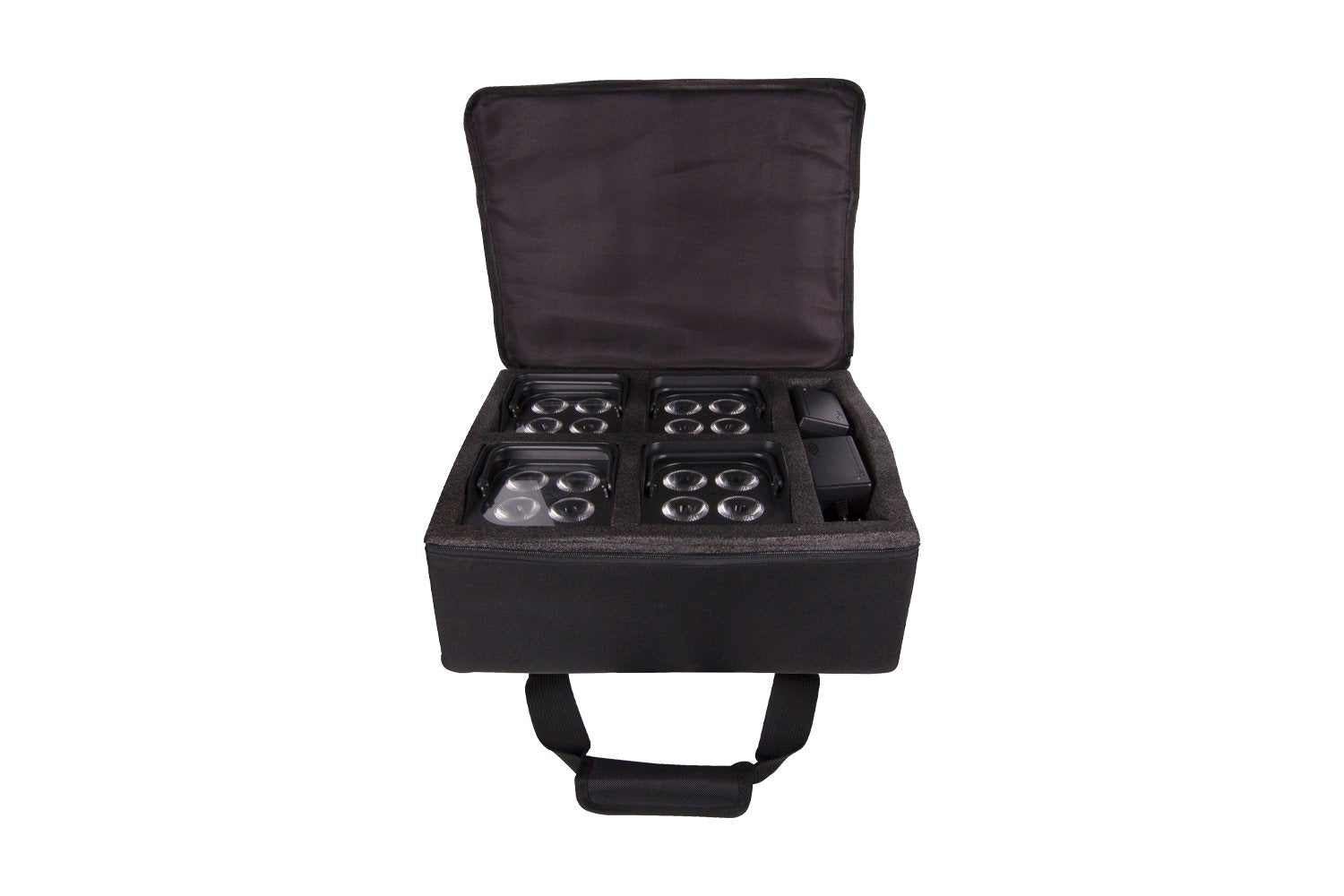 This bundle includes 4 Mobile Par Mini Hex 4 Black LED light fixtures, and also includes a foam lined carrying case designed specifically to hold all four fixtures, cables, and chargers.