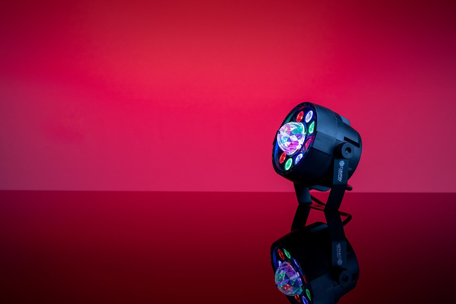Get your party started with the ColorKey PartyLight FX! This compact quad color LED wash light features a motorized RGB party bulb for a one-of-a-kind lighting experience. Paint your walls with color while a rotating RGB bulb sends swirling beams of light across the room. Setup is a breeze when using the included IR remote. It offers quick access numerous built-in programs such as Auto, Chase, Fade and Sound Active mode. Quickly select a static color or one of the numerous patterns to create a fun energetic atmosphere at your next event. PartyLight FX is a great choice for beginners or professionals and will really set the vibe at house parties, events, or at small bars and clubs. PartyLight FX also looks great on camera for live streamers or social media posts.