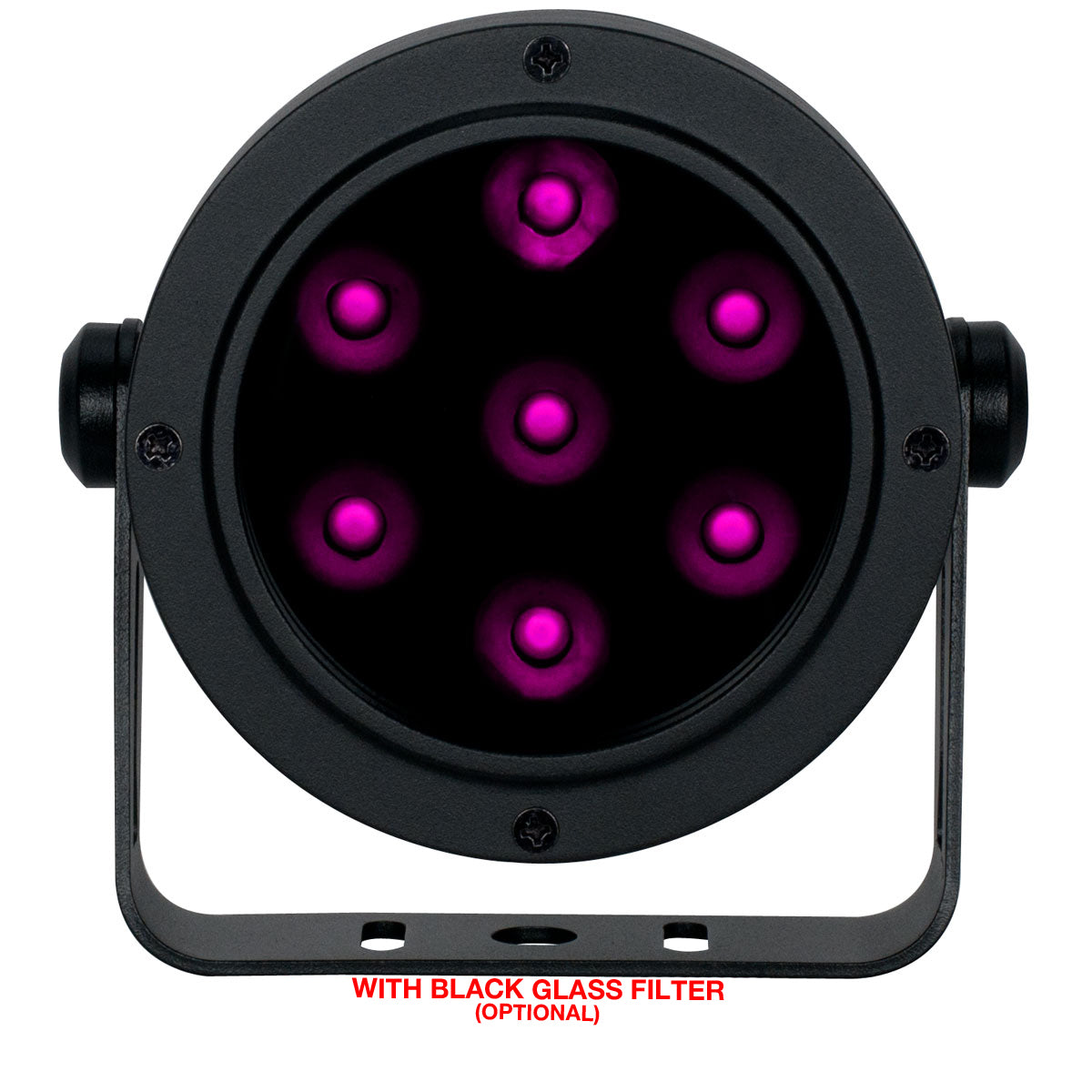 Black glass filters are available for all Prisma™ series UV LED lighting products. The black glass filter blocks all visible light, allowing only the ultraviolet spectrum to effectively illuminate the UV reactive material and nothing else. By completely blacking out all visible light, the black glass filters allow Prisma fixtures to hide discreetly in themed environments, clubs, glow events, or productions of all types.
