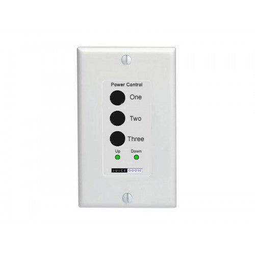 Juice Goose produces the RC5 accessory line as an economical option for power sequencing remote control. Any RC5 operates any Juice Goose CQ Series power sequencer. The RC5-KPS fits in a Decora faceplate. Three button operation controls a CQ power sequencing product or network of products.