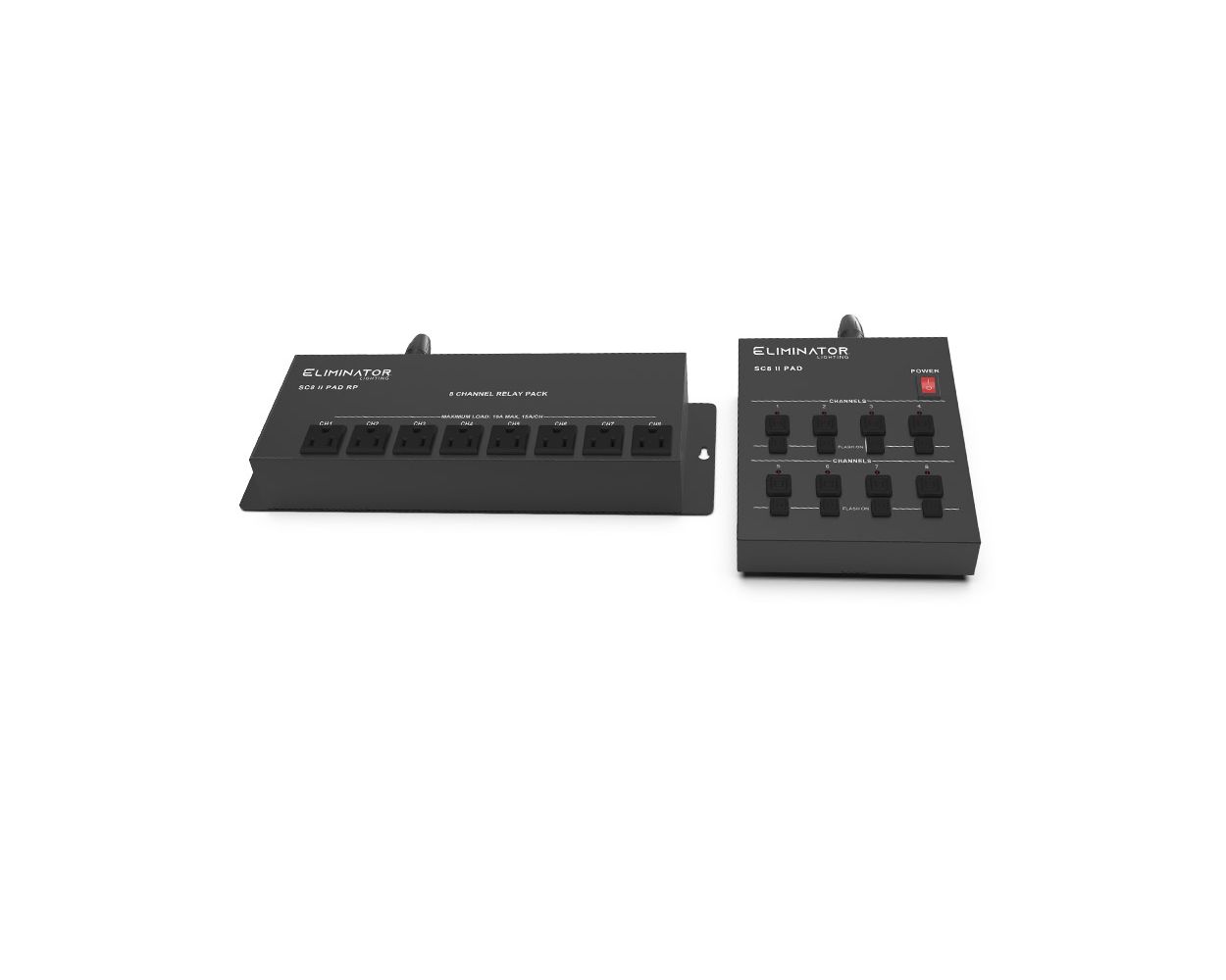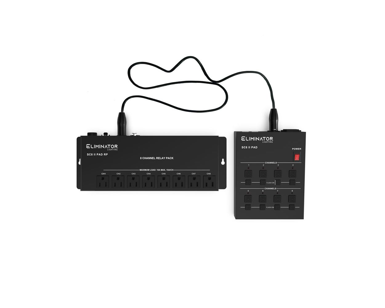 The Eliminator Lighting SC8 II Pad System is an analog On/Off controller with 8 channels and helps eliminate tangled cords and messy wires. The system includes: 1x SC8 II Pad controller, 1x SC8 II PAD RP relay Pack, 1x 25ft. 3-pin DMX Cable and 1x 4ft. IEC Power Cord.