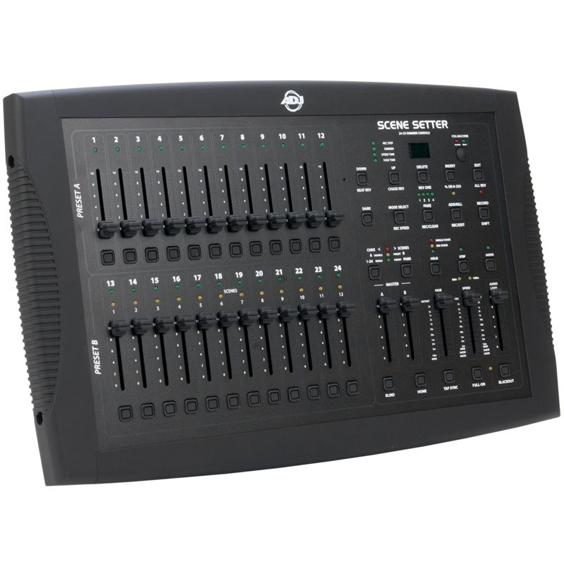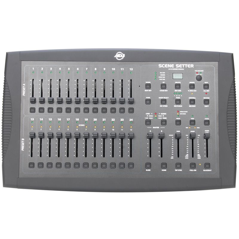ADJ's Scene Setter is a 24 Channel Dimming Console for the purpose of managing the levels of your conventional light entertainment system. With lots of built-in reprogrammable scenes and chases, you can quickly and easily create and manage your light show. This portable control system is perfect for live entertainment stages, mobile DJ's, clubs, bars or for any professional event that requires conventional dimming control of 24 channels or less.