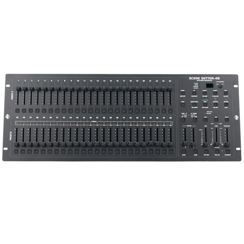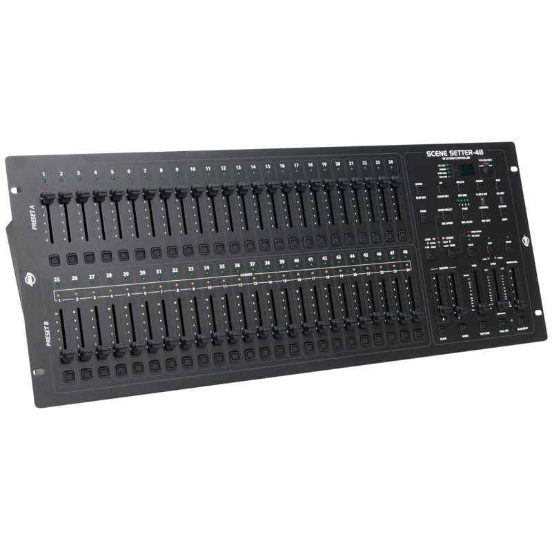 Take your shows to the next level with the essential Scene Setter 48 from ADJ. This 48 channel dimming console will give you the power to create the light show of a lifetime. Tying in your audio and visual production, the scene setter incorporates a line level input that will synchronize the music with your par can lights while also allowing for individual adjustment to each of your pars with its 48 adjustable channel faders. With up to 4,300 programmable scenes and 96 programmable chases (all password protected) and 1,000 scenes per chase, you can rest easy that your unique set-up is kept secure while it runs 12 chases simultaneously. Adjust your fixtures in either percentage or DMX value to achieve the dimming intensity that you desire. With its low weight and bright display, you'll have no trouble moving this controller where it's needed and getting it set up in no time. Master your entire entertainment system with the Scene Setter DMX Dimming Console, and create a light show your crowd won't forget.