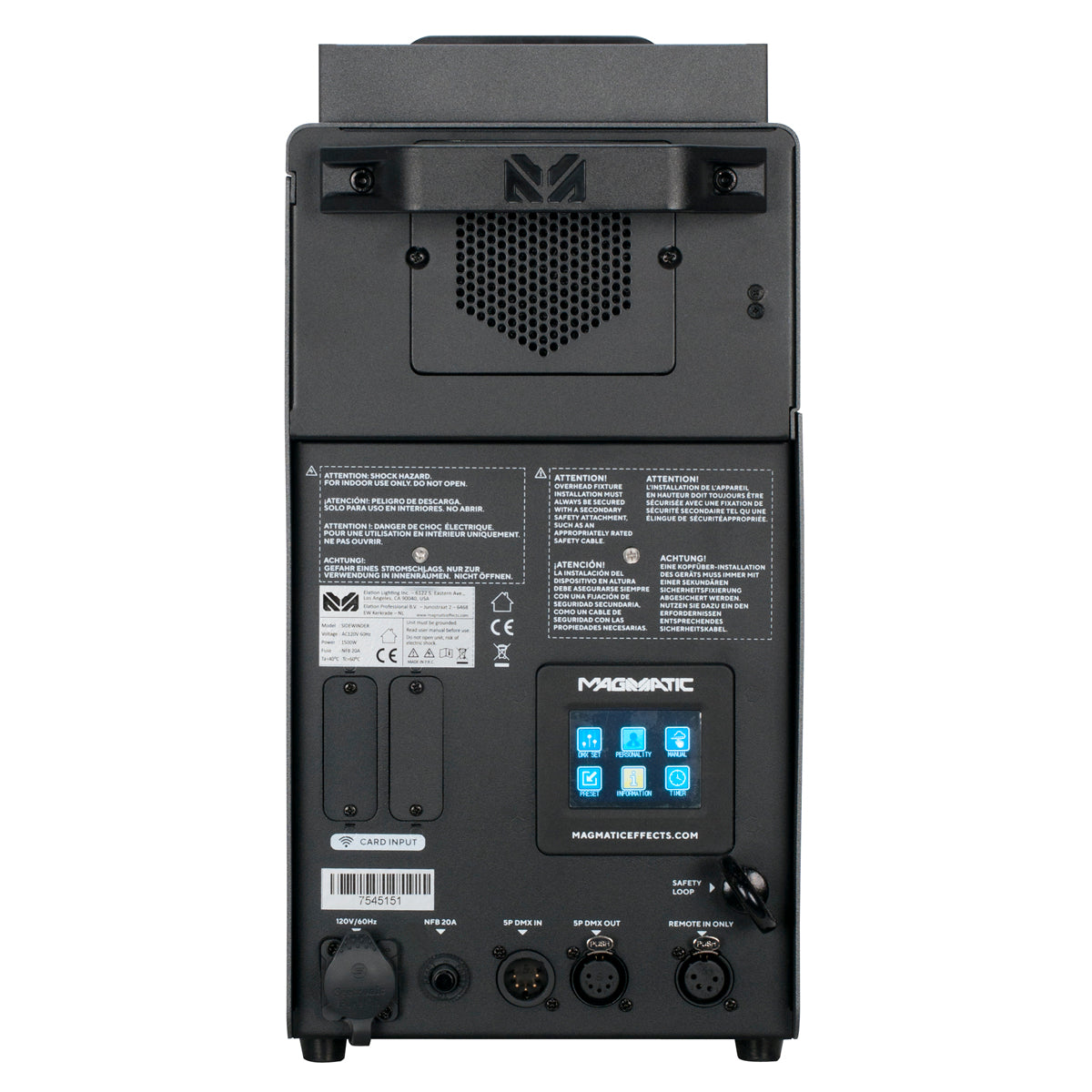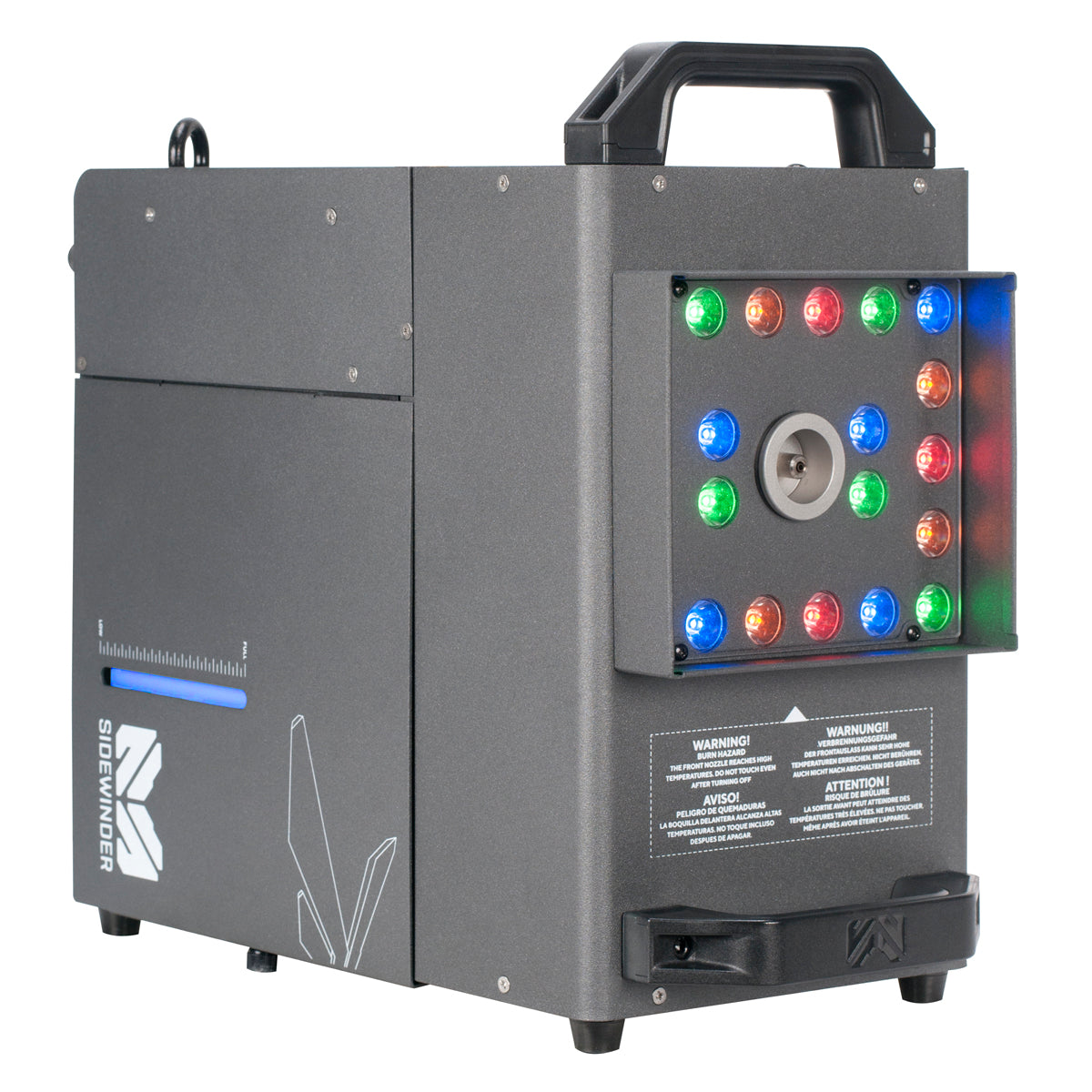 The Magmatic Sidewinder is a high-velocity CO2 simulator fog machine. Including 22 x 2-watt RGBA LEDs. The Sidewinder can burst fog in multiple positions, rotating 180° degrees. Easy to use onboard LCD touch screen control panel, intuitive DMX-512, RDM control, durable aluminum housing, and optional wired and wireless remote control options.