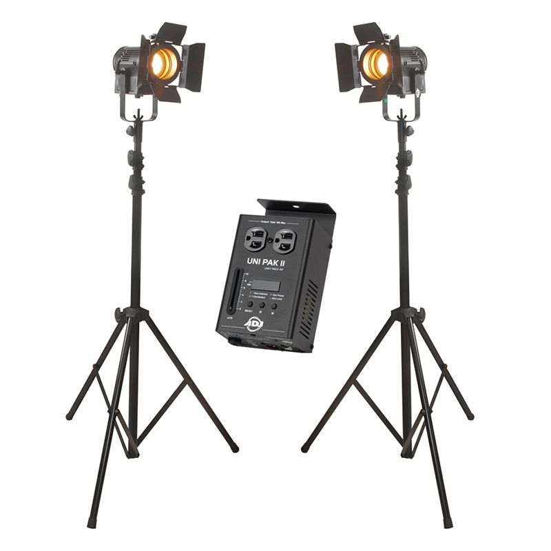 For content producers and multi-person performances who need more light output plus onboard DMX control for front and fill lighting. Includes three LED studio lights for key and fill lighting, barn doors to direct light output, three lighting stands, lighting controller with dimming capabilities, plus DMX cables to connect the lights to the controller.