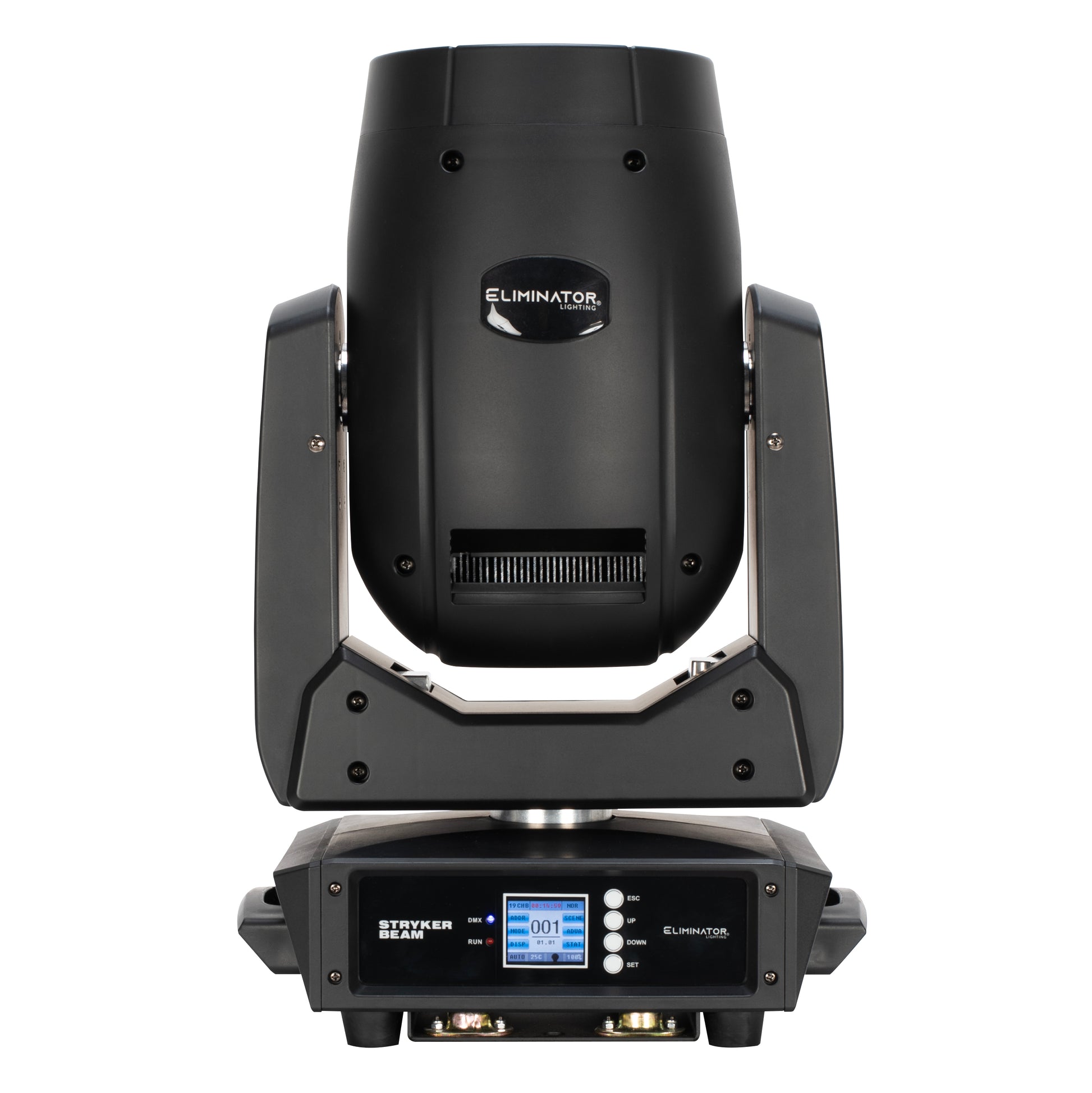 For a fixture of its class, the Stryker Beam is a compact and lightweight moving head, which is easily portable. It features a large full color display screen, providing access to an intuitive menu-driven interface for DMX addressing and customization of the unit’s operating parameters. It features locking power input and output sockets, to allow multiple fixtures to daisy chain from a single outlet, together with both 3-pin and 5-pin DMX sockets for easy integration into any existing DMX system.