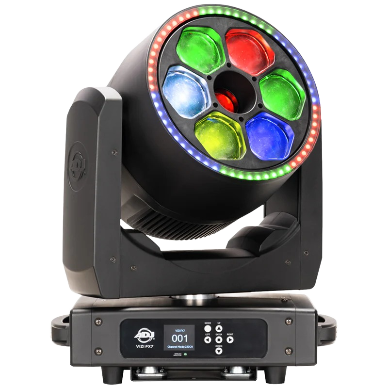 The ADJ Vizi FX7 is a 4-in-1, 420W RGBL Moving Head Beam Wash kaleidoscope ring fixture, offering three powerhouse effects for stage, event, or venue spaces.