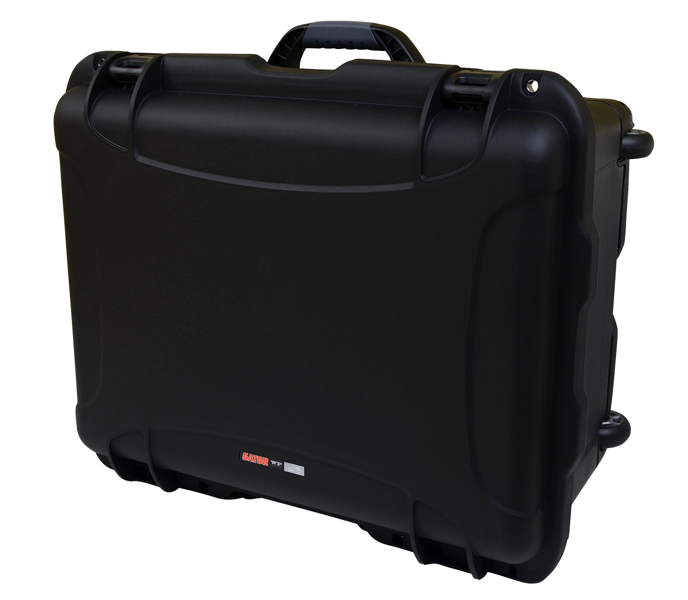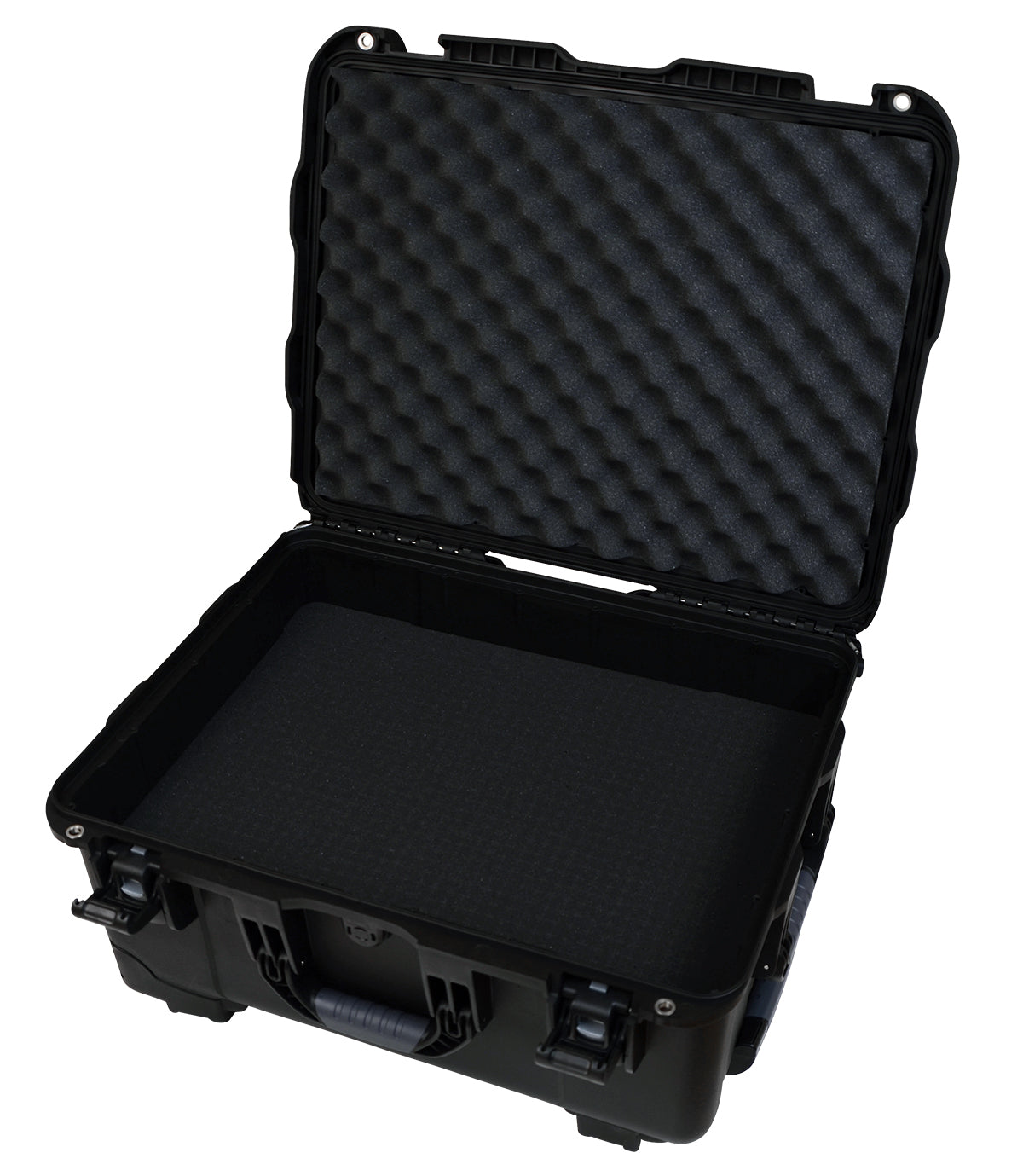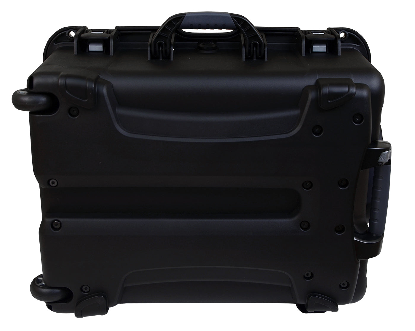 Black injection molded case with pullout handle, inline wheels, and Interior dims 20.5″ x 15.3″ x 10.1″. DICED FOAM