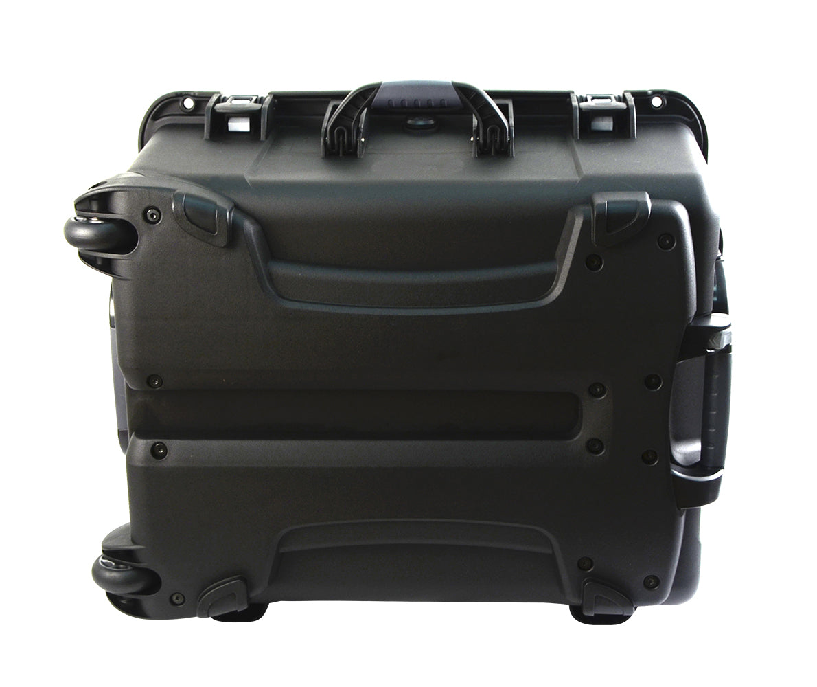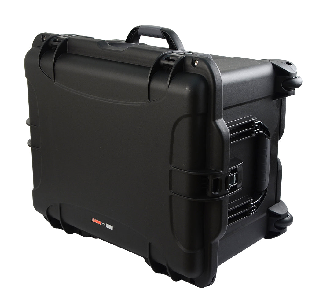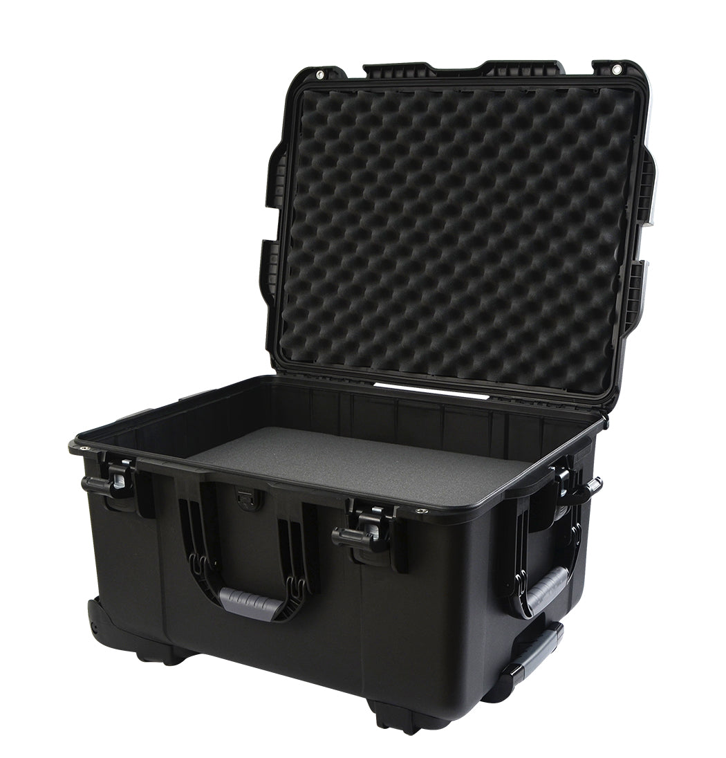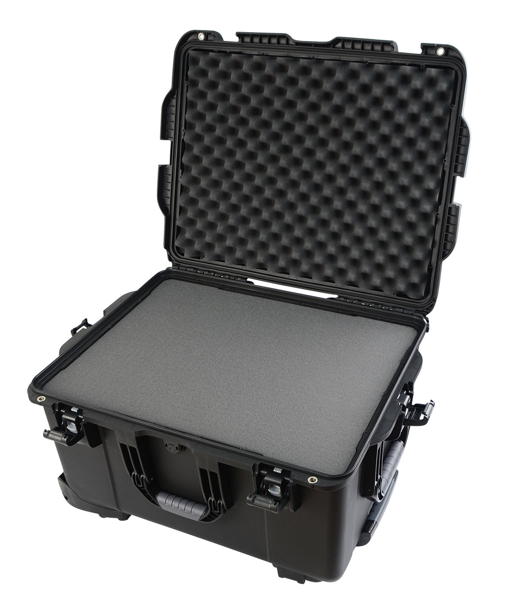 Black injection molded case with pullout handle, inline wheels, and interior dims 22″ x 17″ x 12.9″. DICED FOAM