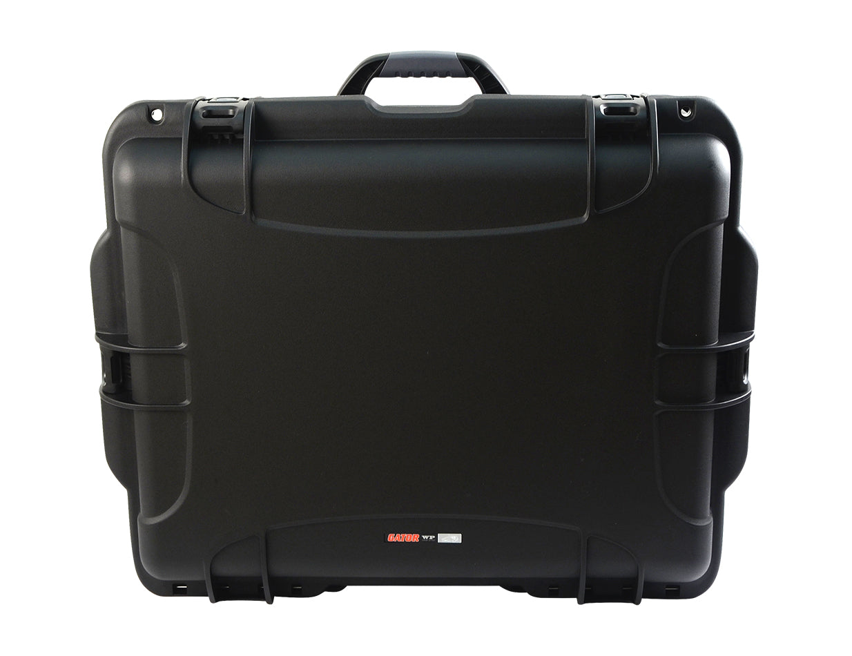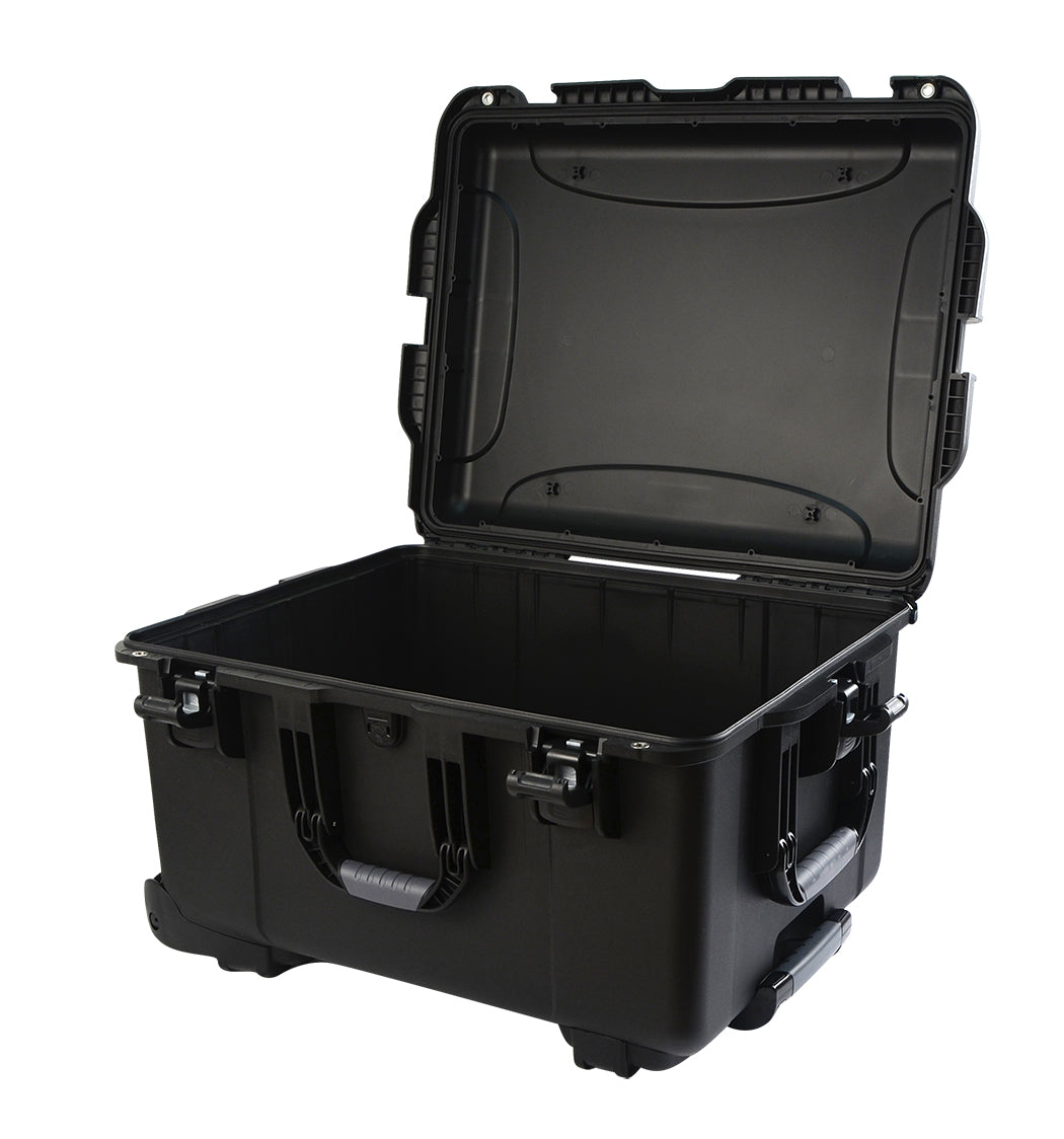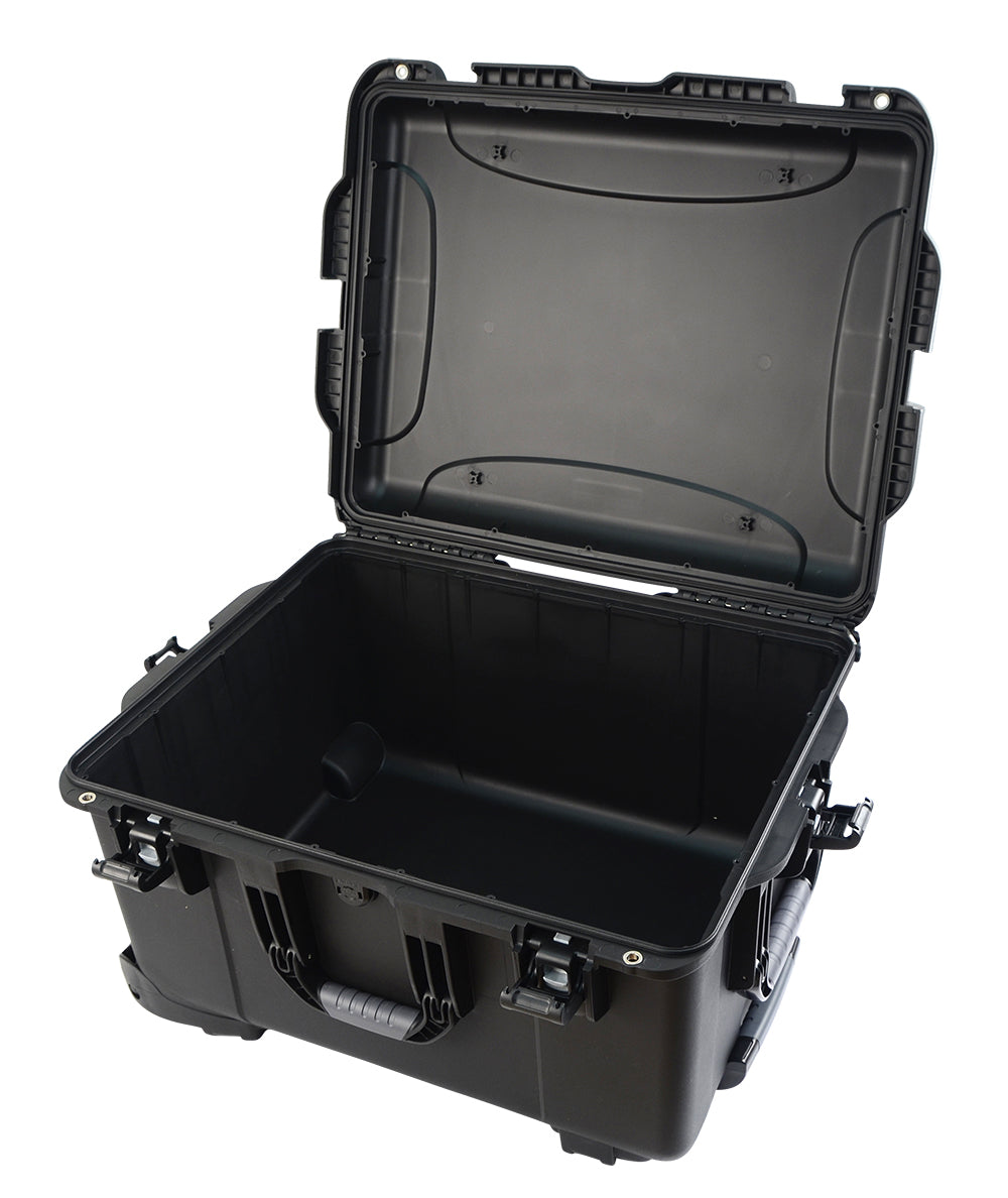Black injection molded case with pullout handle and inline wheels. Interior dims 22″ x 17″ x 12.9″. NO FOAM