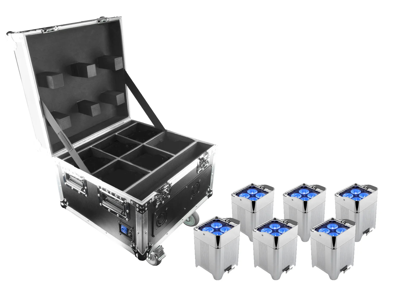 Includes: 6 WELL Fit fixtures in an Integrated Flight Case/Charging Unit, PowerCON Power Cord ,